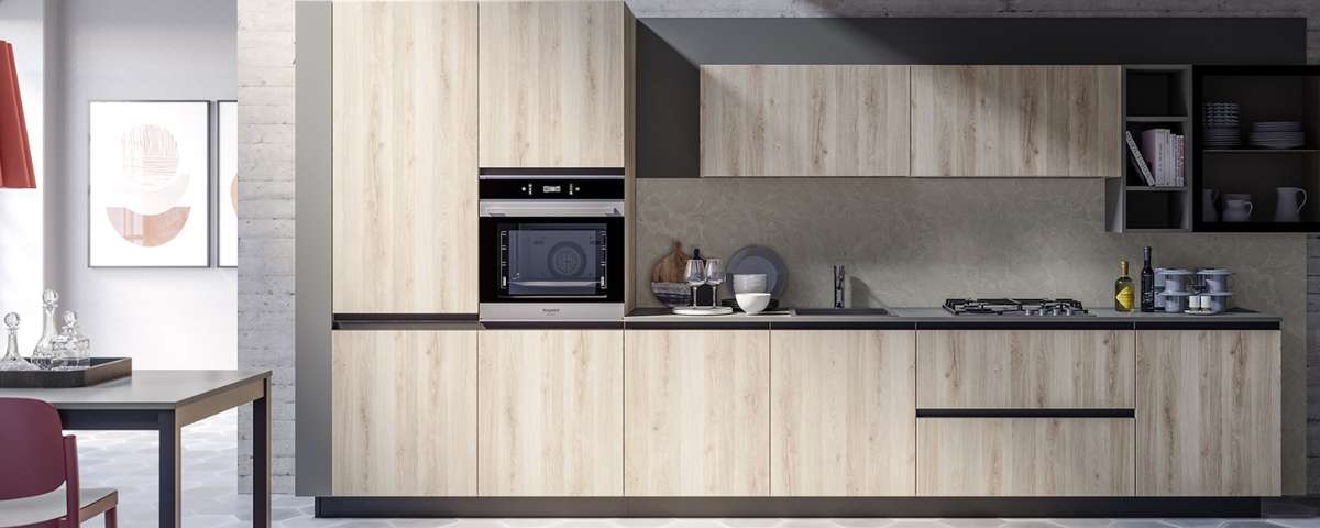 Per arredare una cucina rettangolare stretta, una delle soluzioni possibili è la cucina lineare. Sfrutta l’intero lato lungo della stanza per inserire gli armadi, i pensili, i fuochi, la cappa, il forno e il frigorifero. La parete opposta potrai sfruttarla avvitando al muro ganci e binari su cui appendere, ad esempio, i grembiuli e gli strofinacci puliti, che non ingombrano.