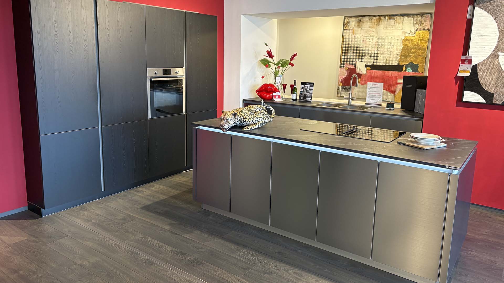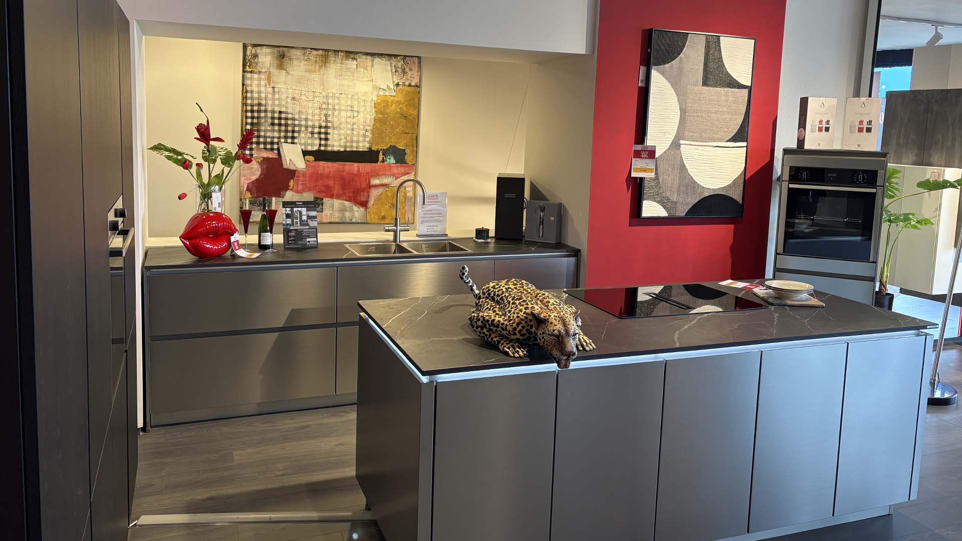 Cucina Iris moderna di design con colonne attrezzate, ante chiare abbinate a pensili color bordeaux e dettagli effetto legno. Soluzione elegante e funzionale, ideale per ambienti contemporanei. Completa di zona lavaggio, cottura e forno integrato.