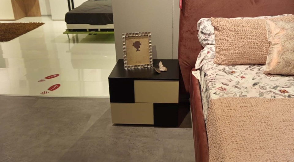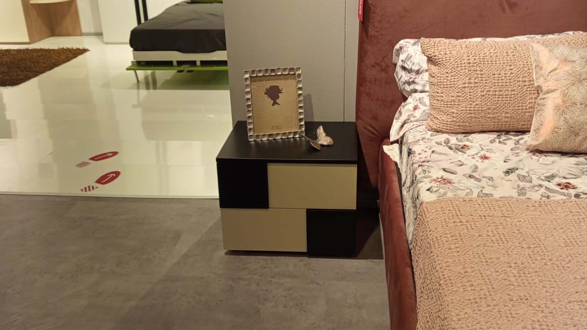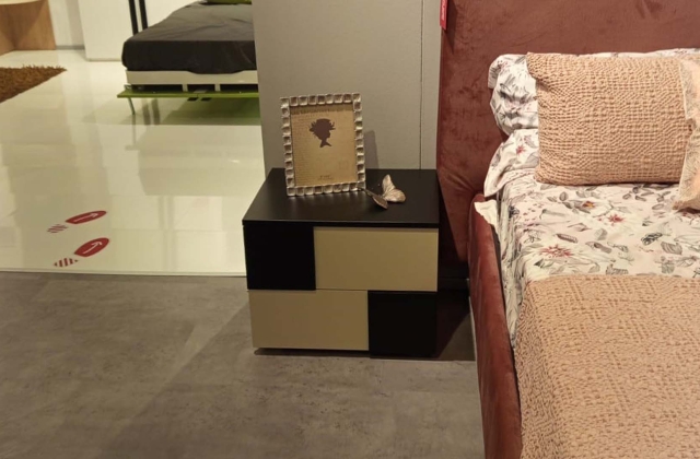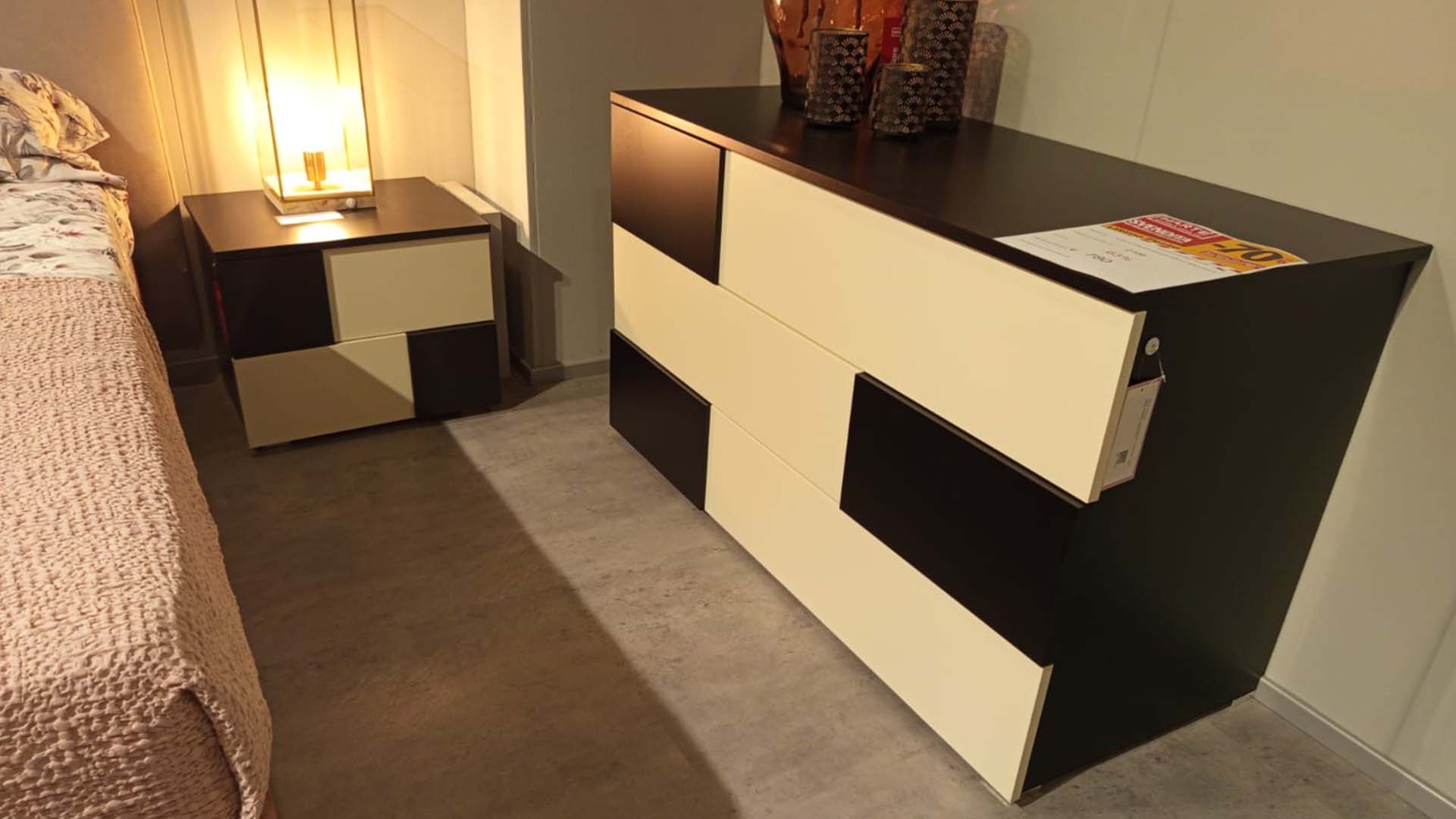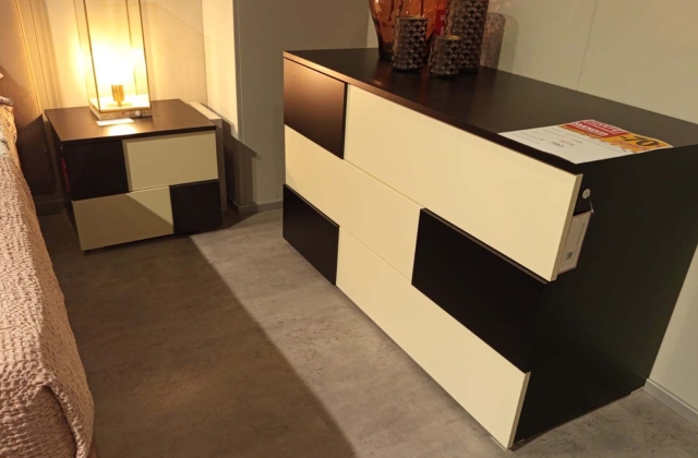 Gruppo notte composto da 1 comò e 2 comodini in finitura perla e nero opaco.