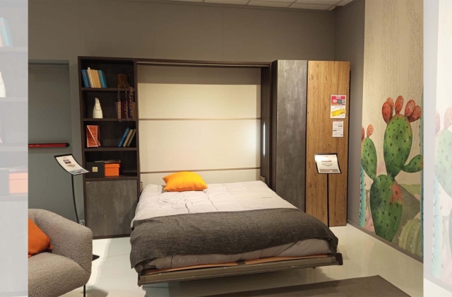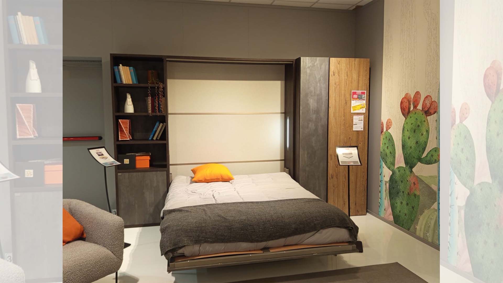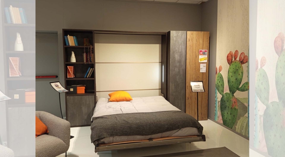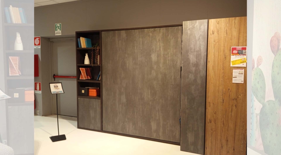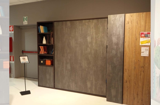 Libreria convertibile con letto a ribalta, in finiture quercia scuro e quercia chiara.