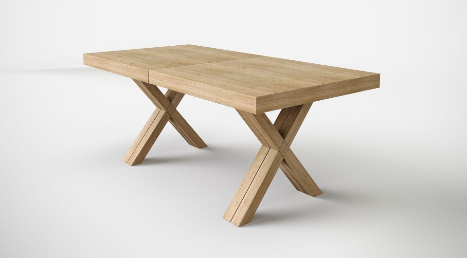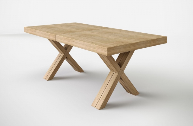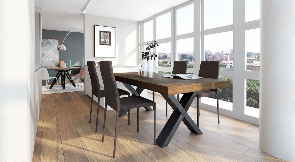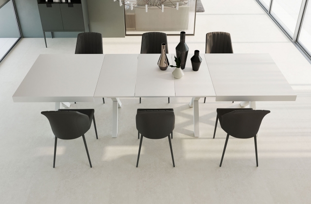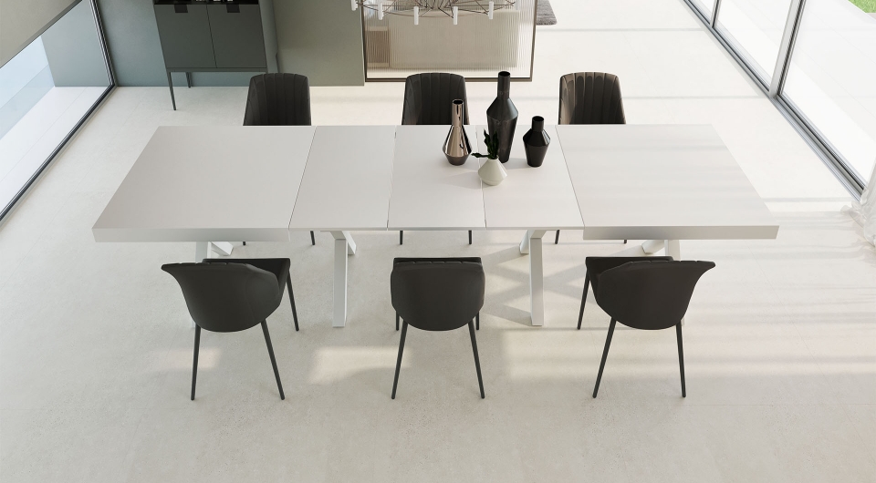 Il tavolo è modulabile e può essere allungato da 2 a 5 metri, con allunghe da 50 cm . Tutte le allunghe sono alloggiate dentro il tavolo.