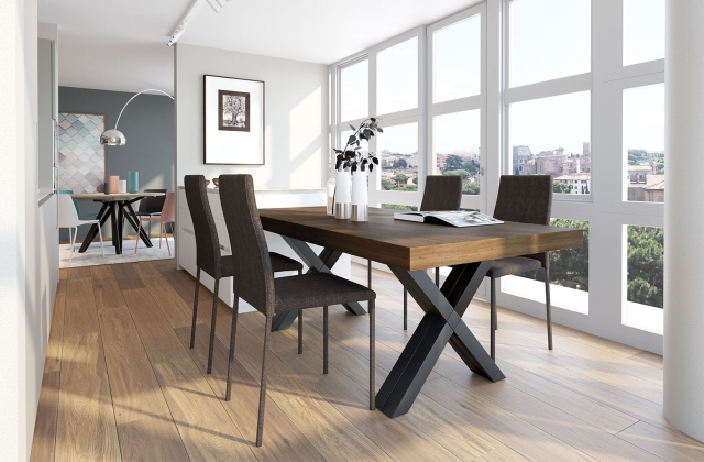 Tavolo rettangolare allungabile con struttura, piano e allunghe in melaminico.