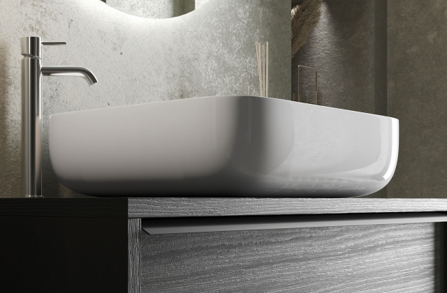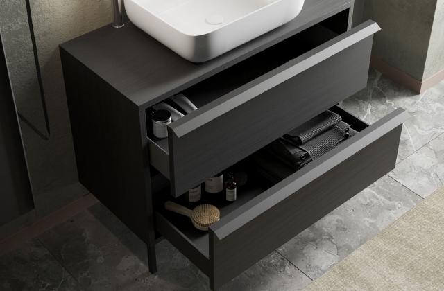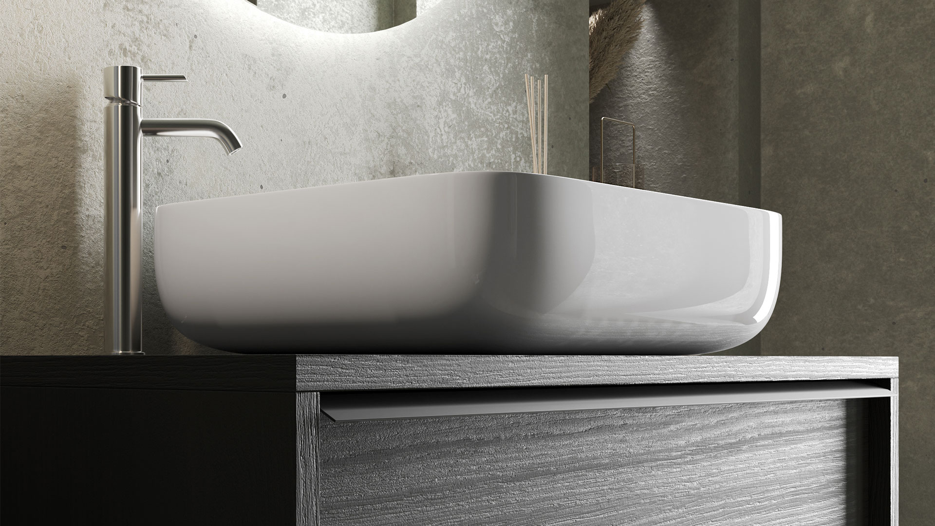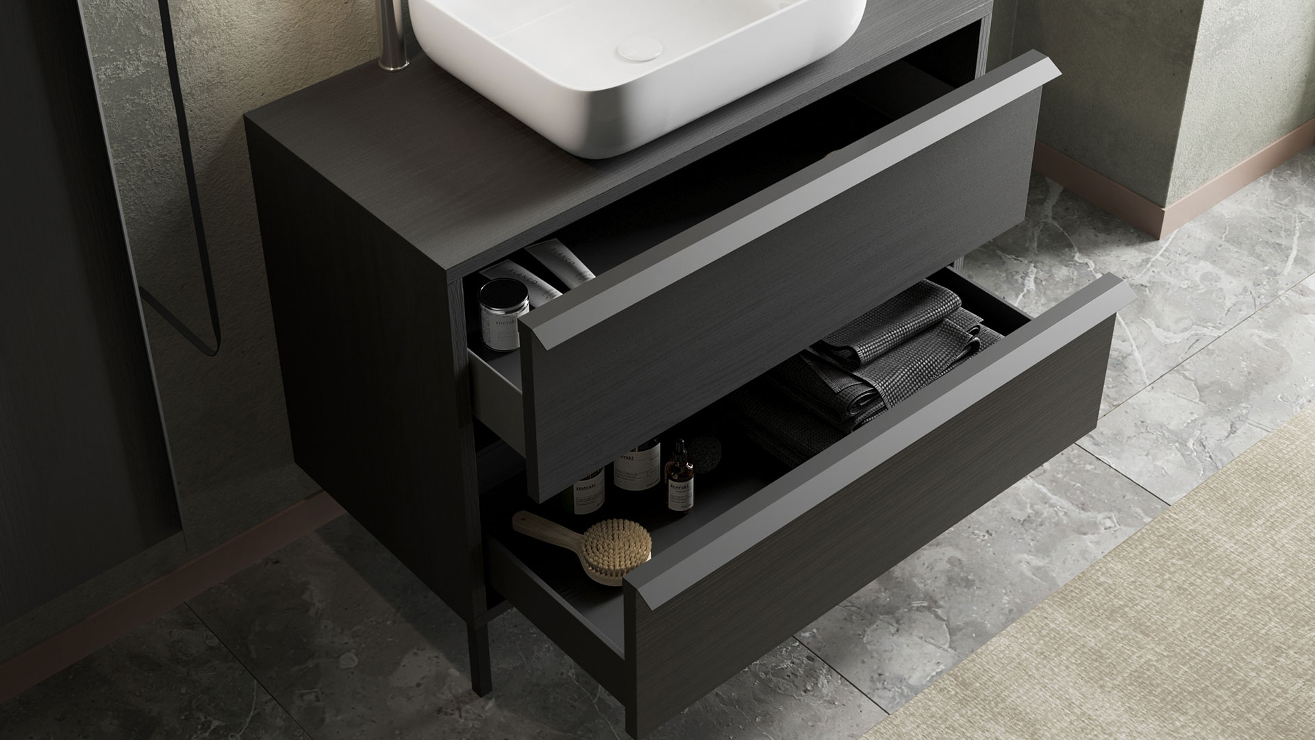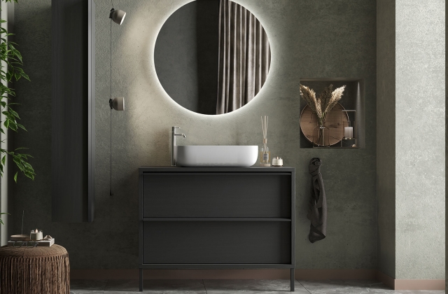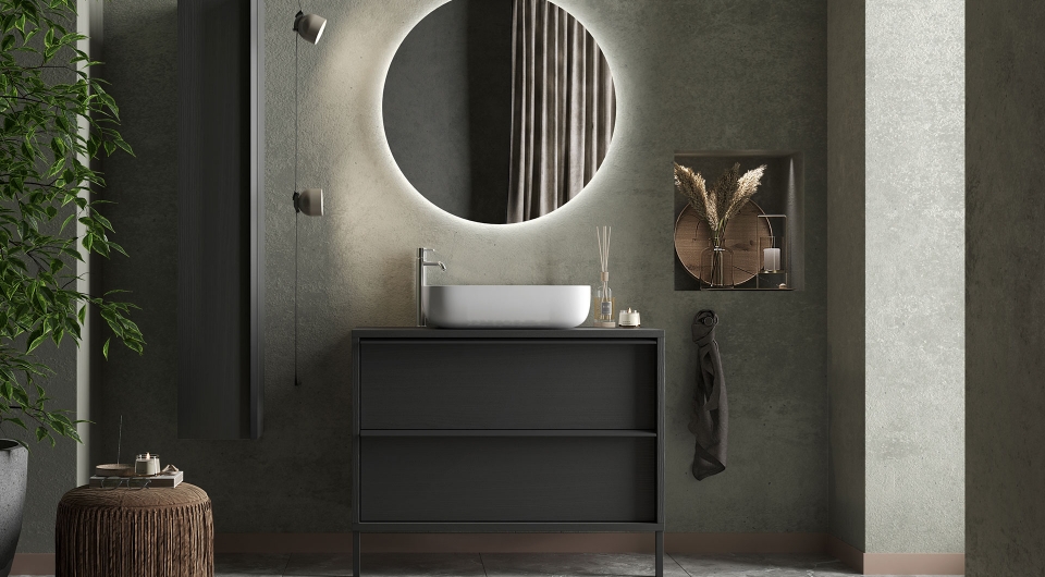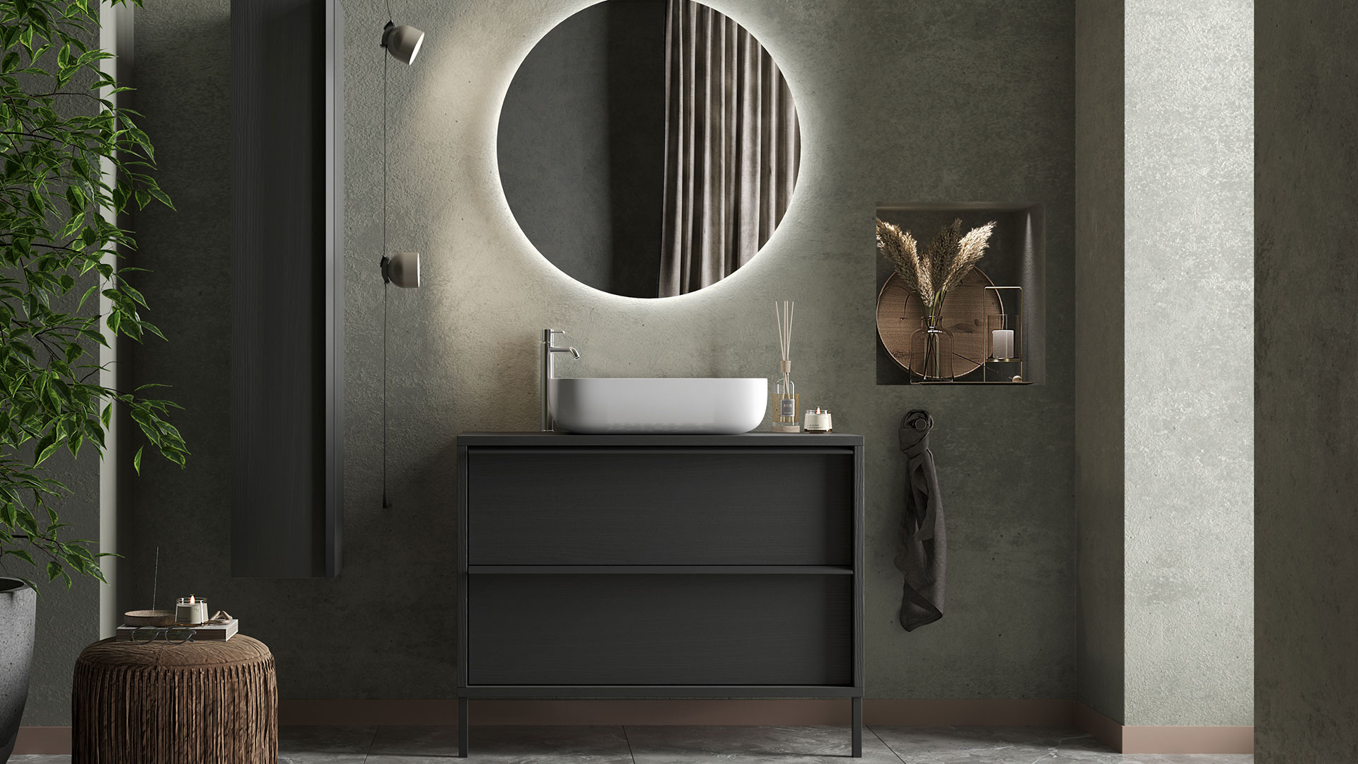 Mobile bagno composto da base a terra e 2 cassetti a chiusura rallentata L.92xP.45xH.138, specchiera retroilluminata Ø80 cm e da una colonna per riporre tutti i tuoi oggetti da bagno.