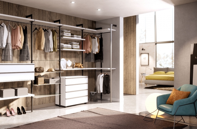 I montanti a vista in stile Industrial in contrasto con accessori, moduli e cassetti in bianco, rendono questa cabina armadio uno spazio sviluppato con stile moderno, ma al tempo stesso il luogo ideale in cui riporre abiti e accessori, e godersi una zona di assoluta intimità.