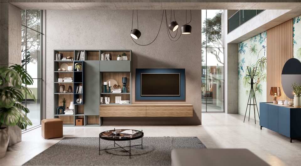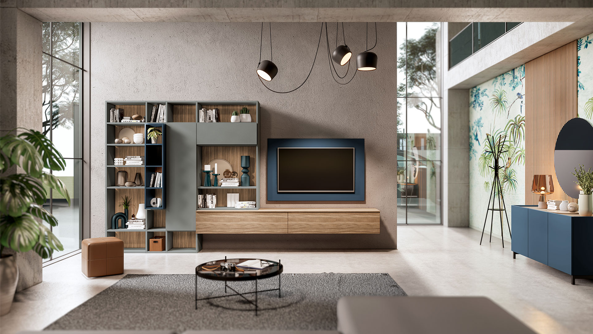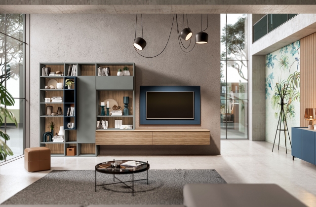 Una composizione che, grazie alla combinazione di vari moduli, riesce a sfruttare tutto lo spazio a disposizione e a dare carattere e personalità al tuo living.