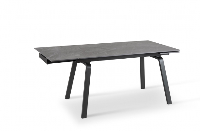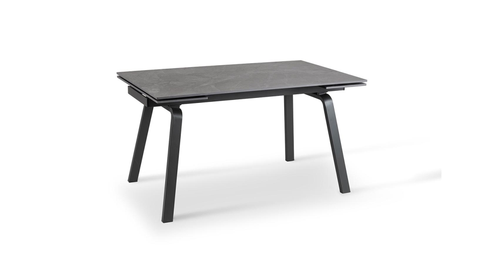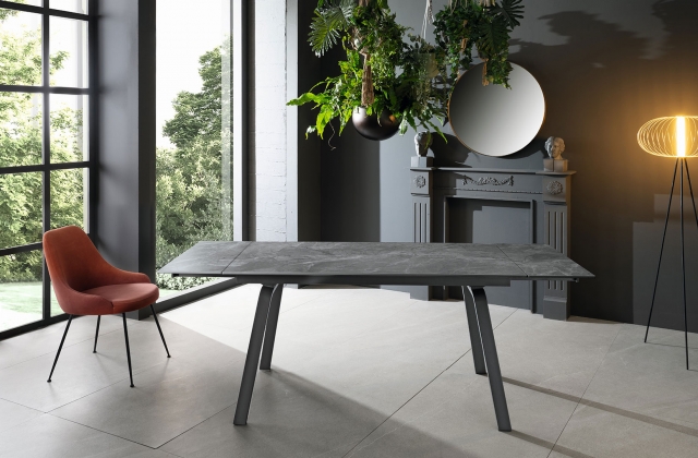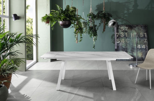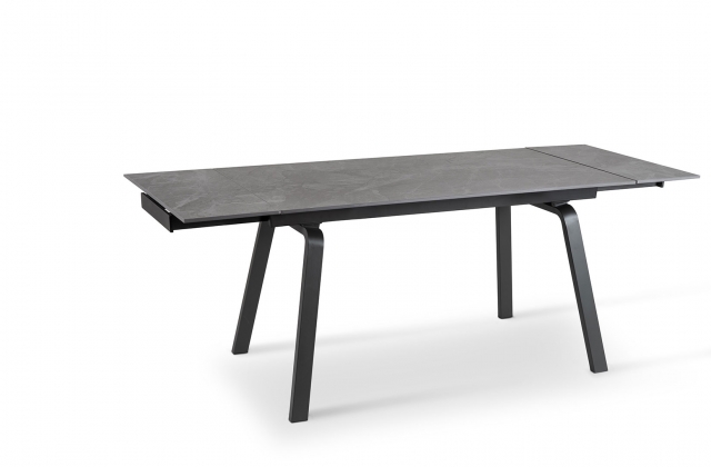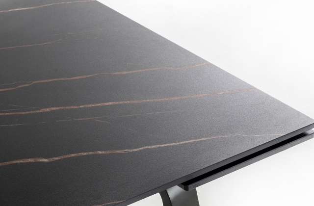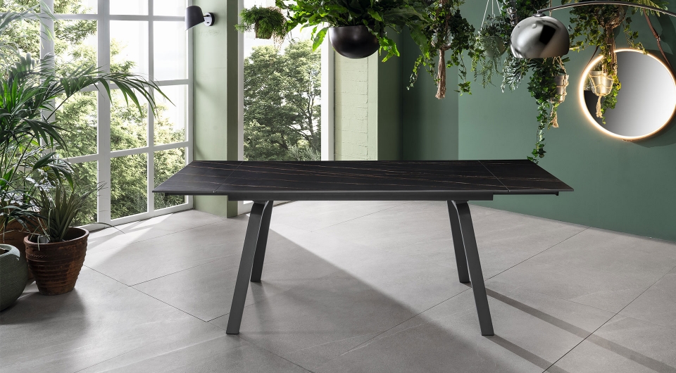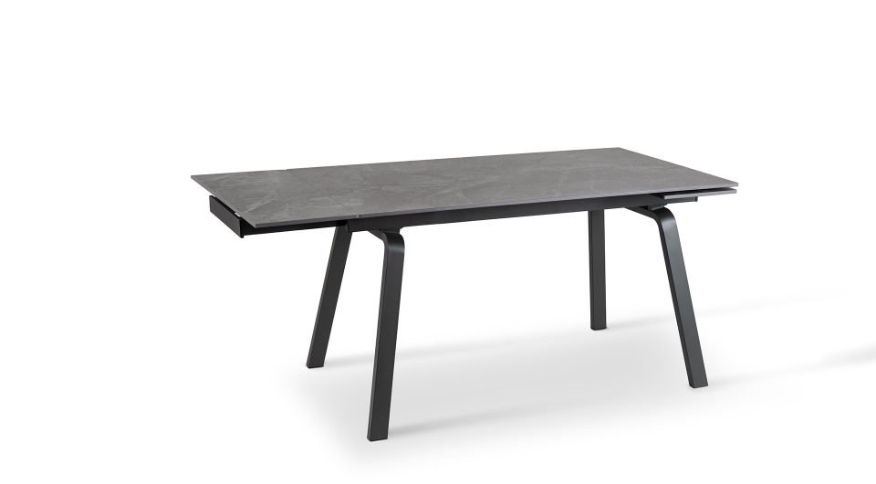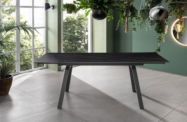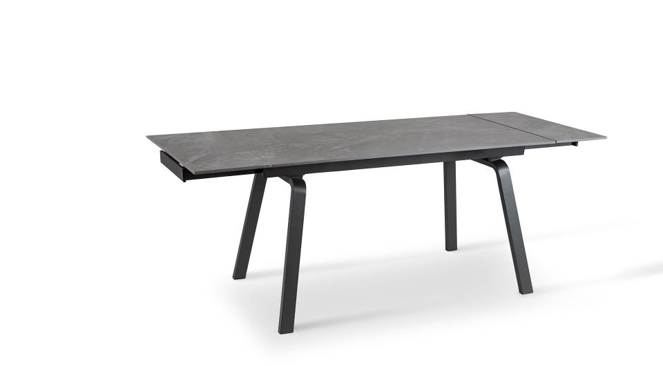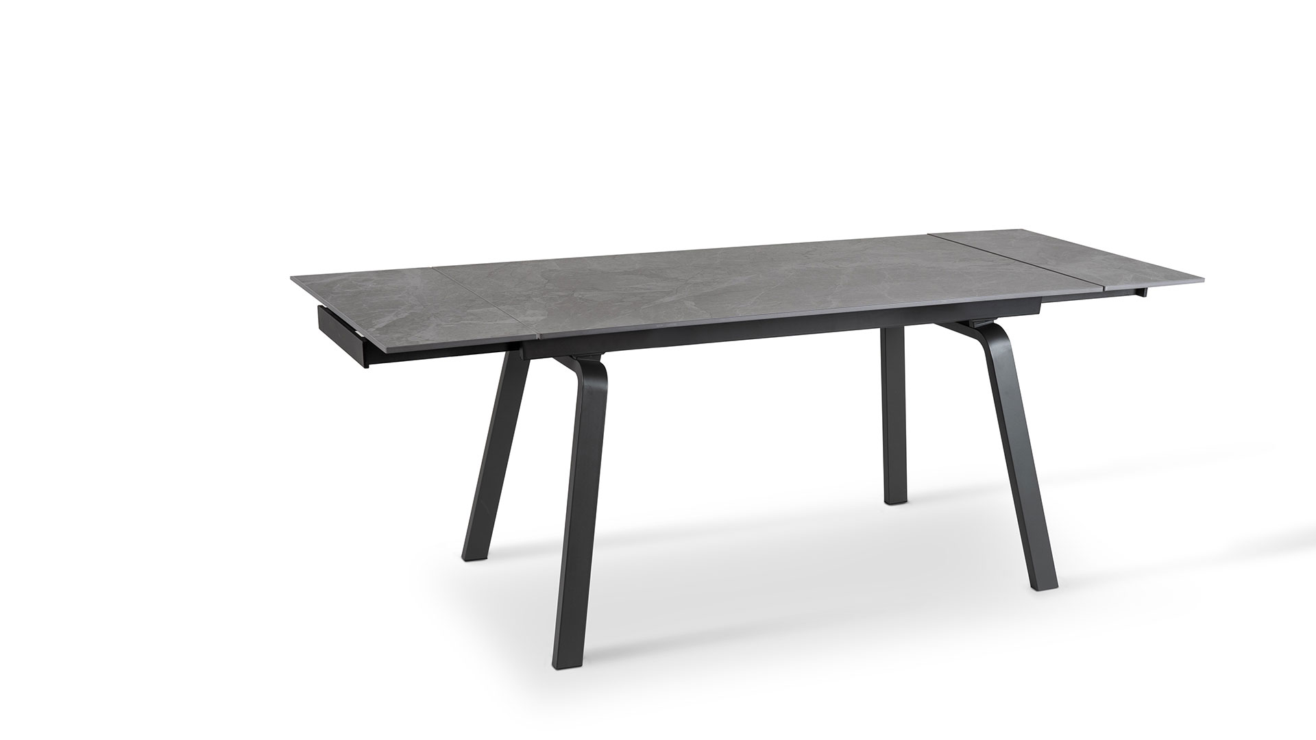 Pratico tavolo allungabile con due allunghe interne per poter accogliere al meglio i comodi pranzi della domenica da passare con amici o parenti; le gambe sono realizzate in metallo verniciato, mentre il top è in pietra sinterizzata effetto marmo.