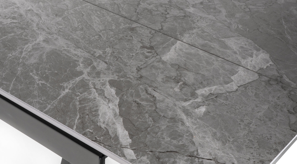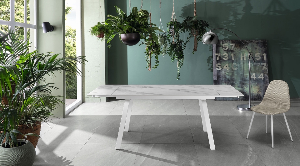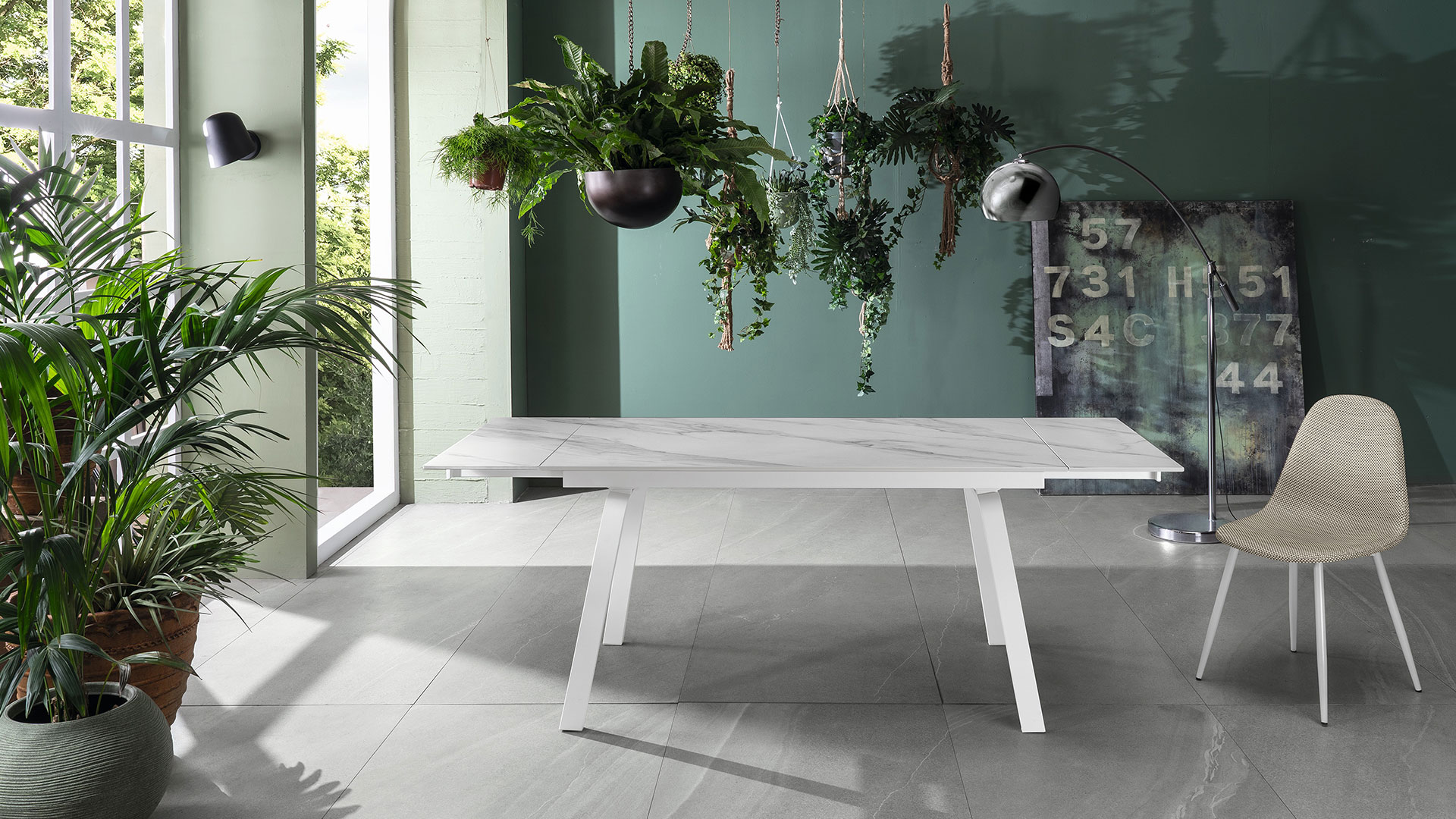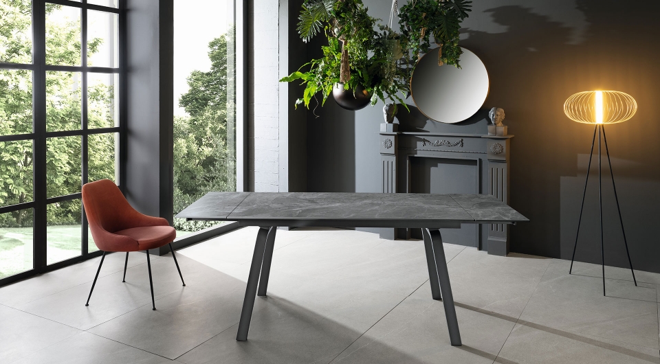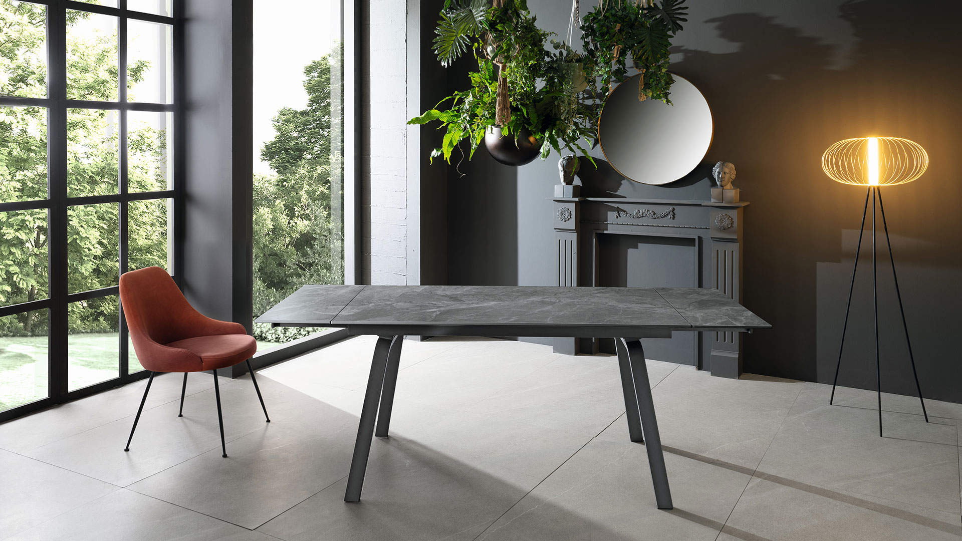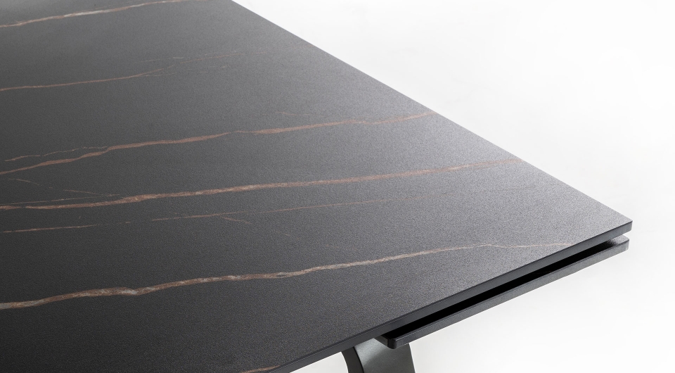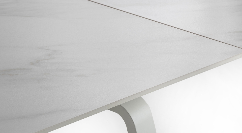 Pratico tavolo allungabile con due allunghe interne per poter accogliere al meglio i comodi pranzi della domenica da passare con amici o parenti; le gambe sono realizzate in metallo verniciato, mentre il top è in pietra sinterizzata effetto marmo.