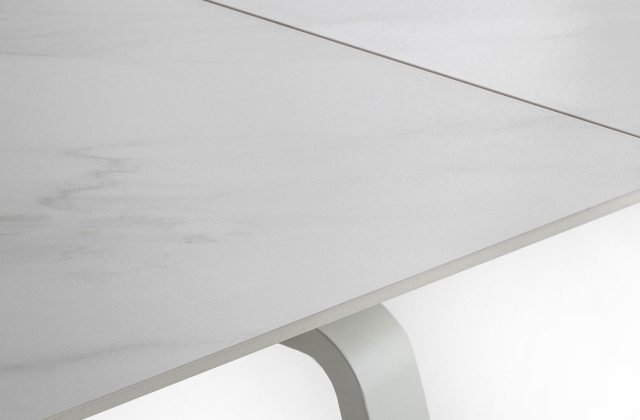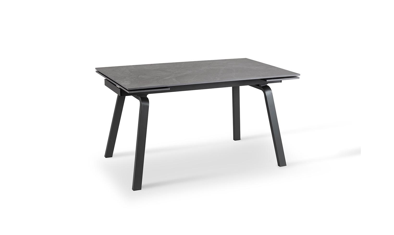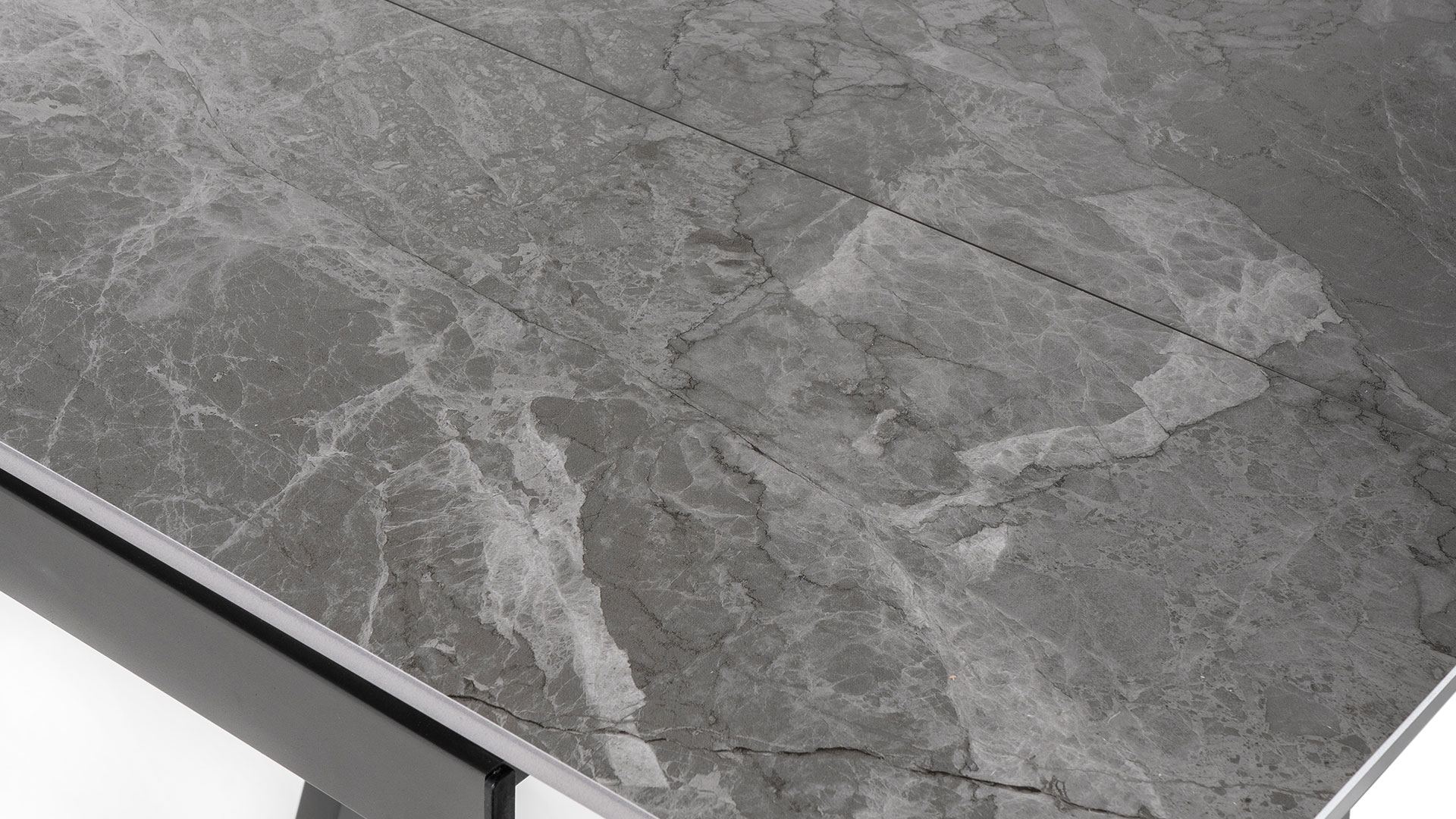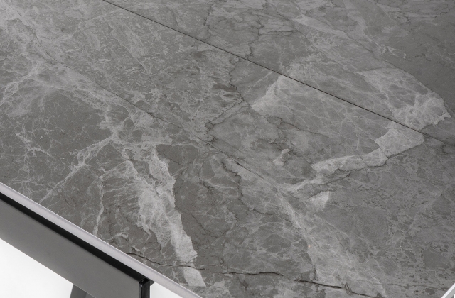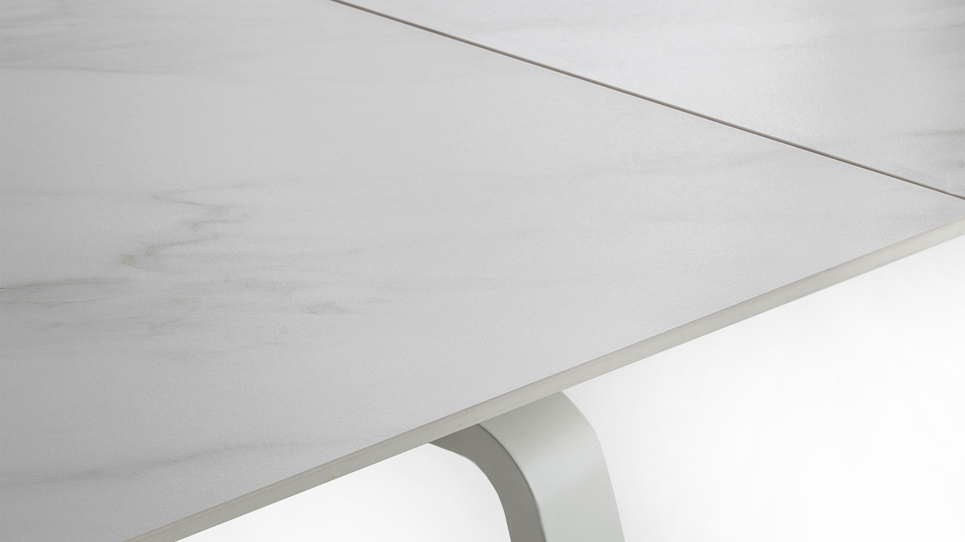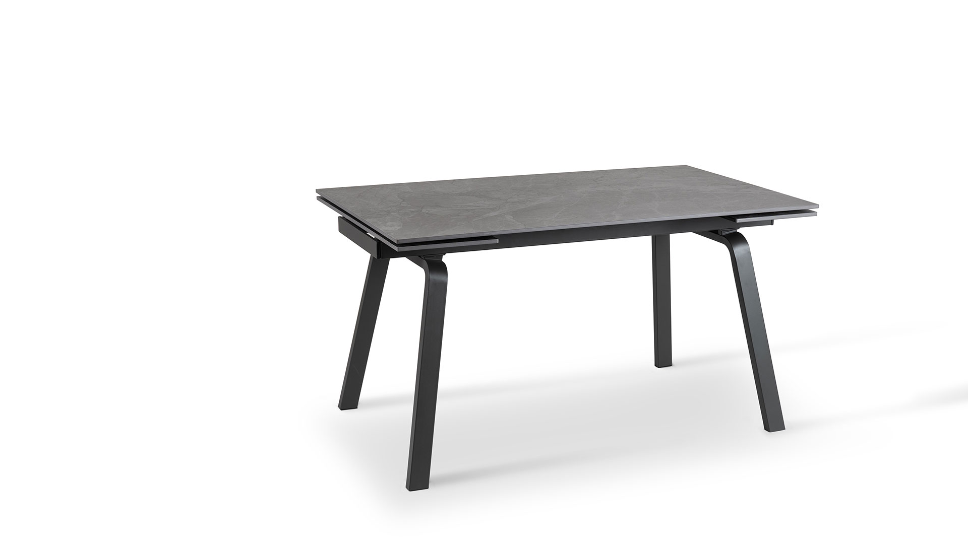 Pratico tavolo allungabile con due allunghe interne per poter accogliere al meglio i comodi pranzi della domenica da passare con amici o parenti; le gambe sono realizzate in metallo verniciato, mentre il top è in pietra sinterizzata effetto marmo.