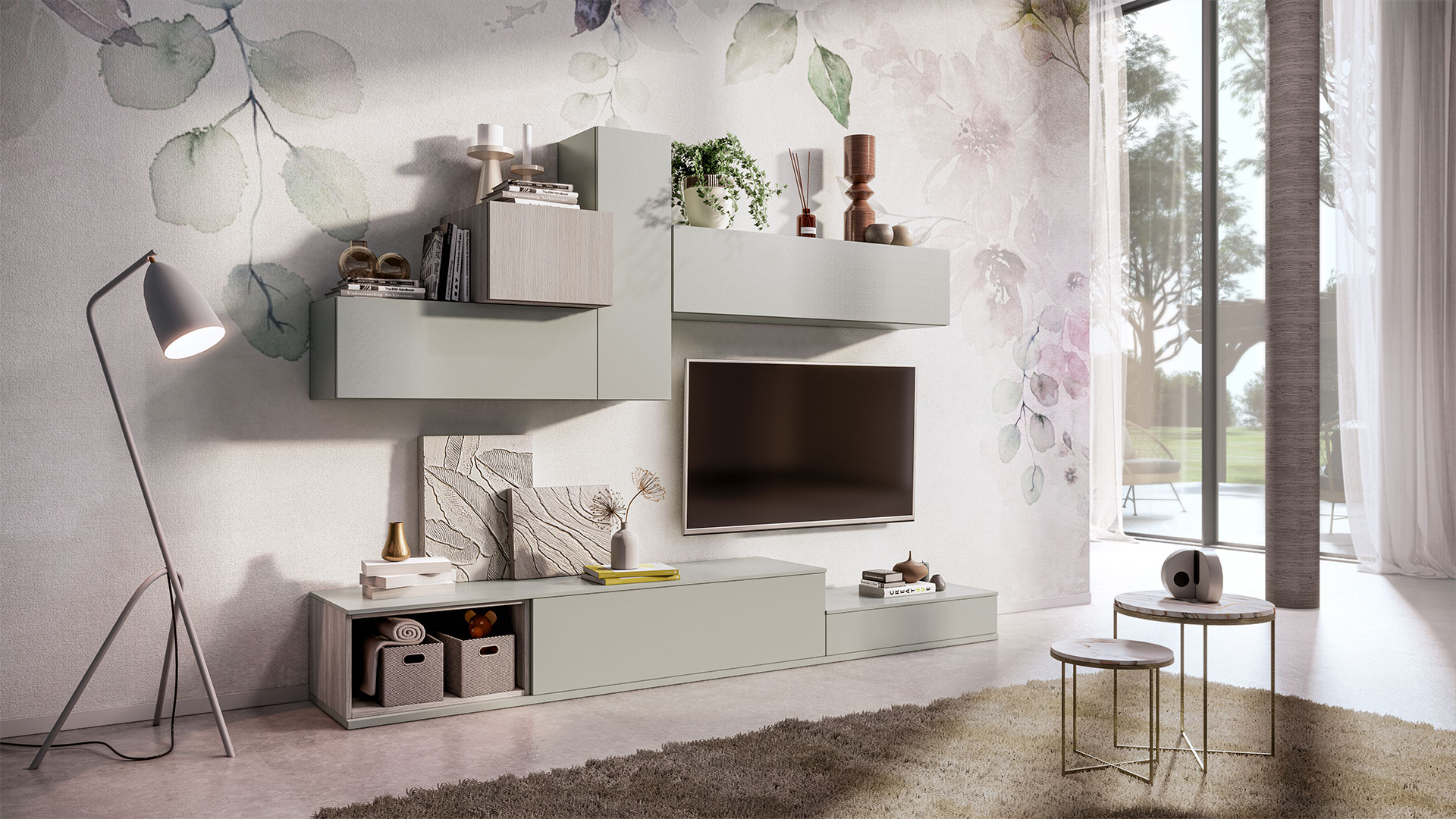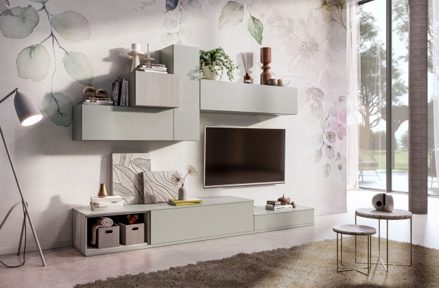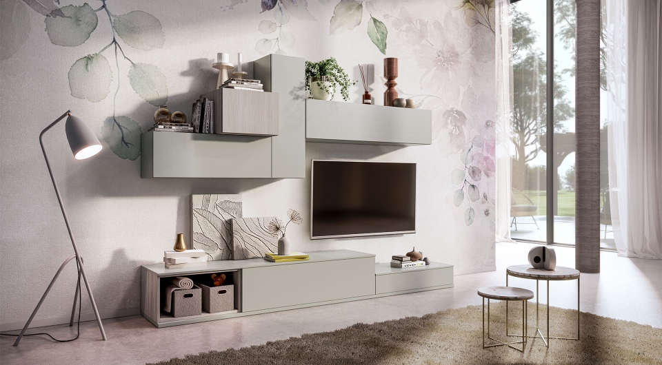 Componi tu la tua parete ridisegnando spazi e geometrie, aggiungendo librerie e vani a giorno e scegliendo le finiture più adatte al tuo soggiorno.