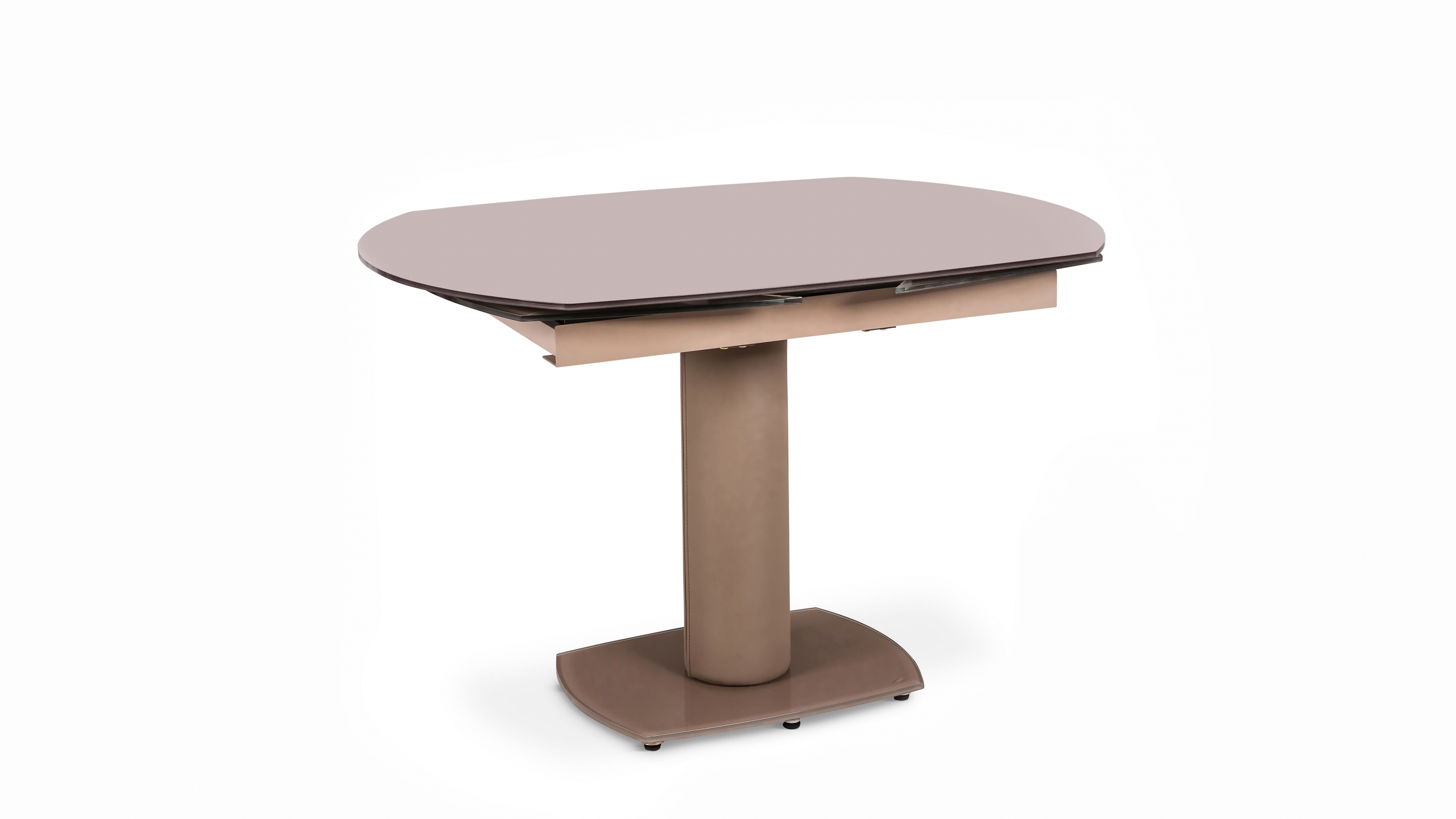 Tavolo allungabile con top ovale e gamba in ecopelle, disponibile in vari colori.