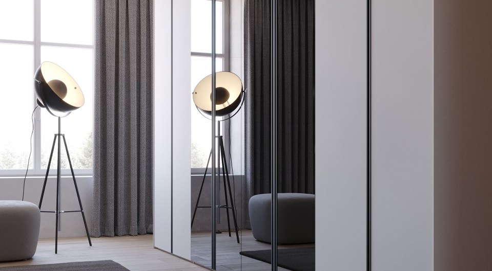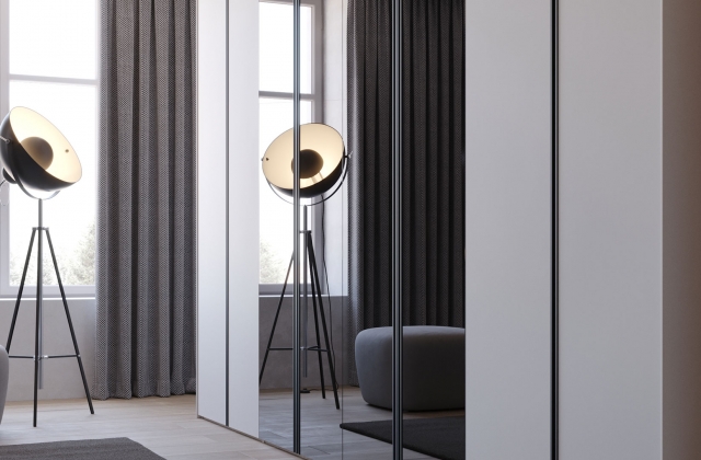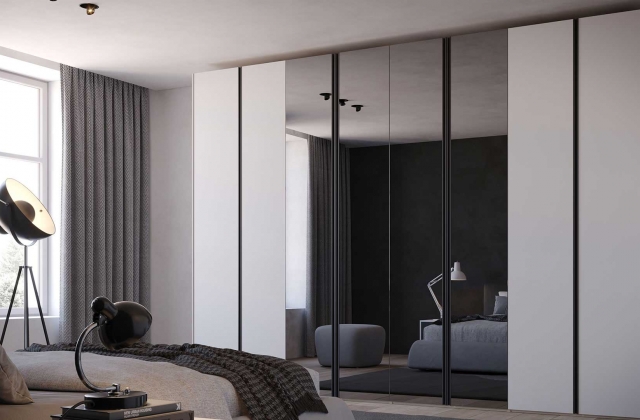 Un armadio con specchi integrati che darà subito un tocco di classe alla tua camera.  I pannelli laterali in laccato opaco cedono il posto ai pannelli centrali nella parte centrale della composizione.