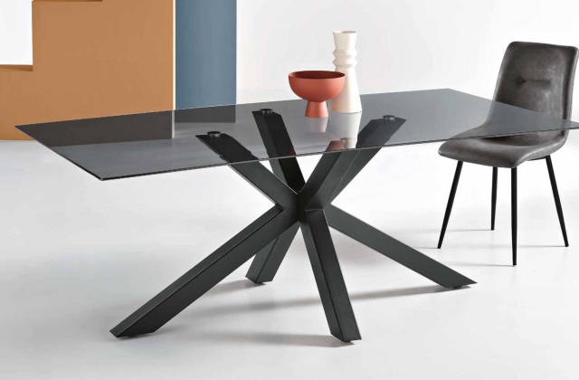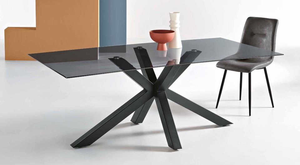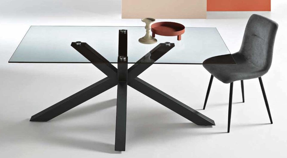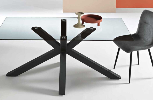 Elegante tavolo fisso realizzato con una robusta struttura in acciaio verniciato sovrastata da un piano in vetro temperato resistente e perfetto per durare per durare nel tempo anche con un utilizzo quotidiano.