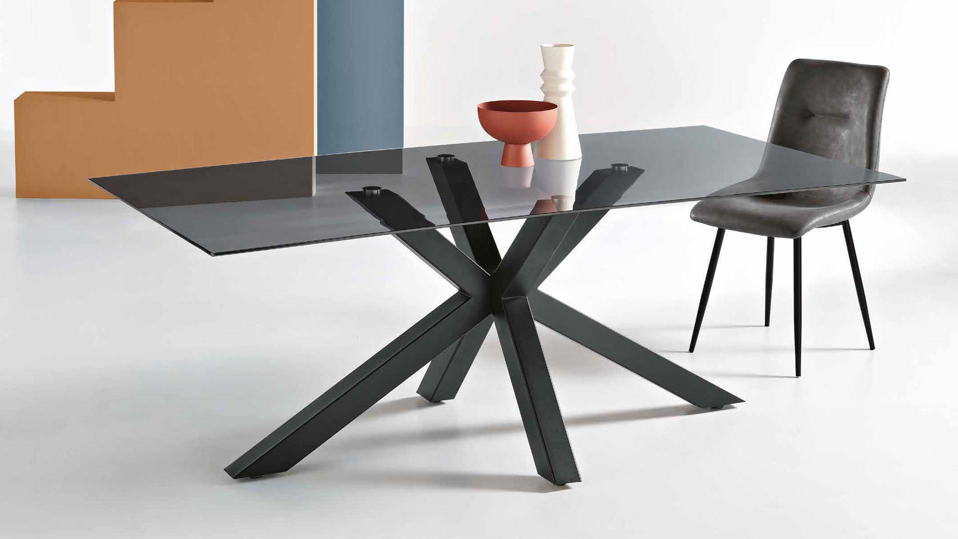 Elegante tavolo fisso realizzato con una robusta struttura in acciaio verniciato sovrastata da un piano in vetro temperato resistente e perfetto per durare nel tempo anche con un utilizzo quotidiano.
