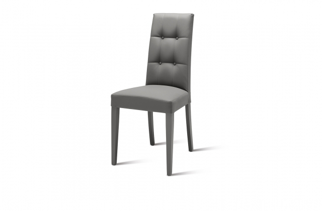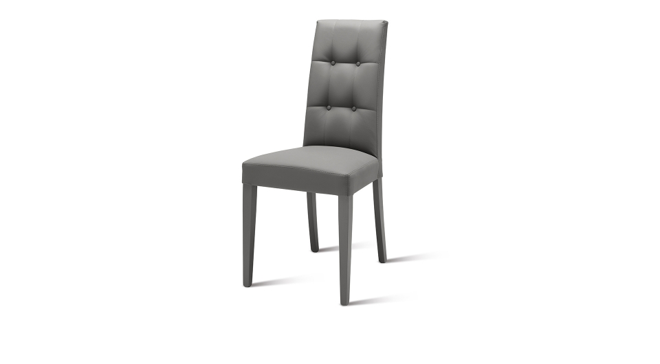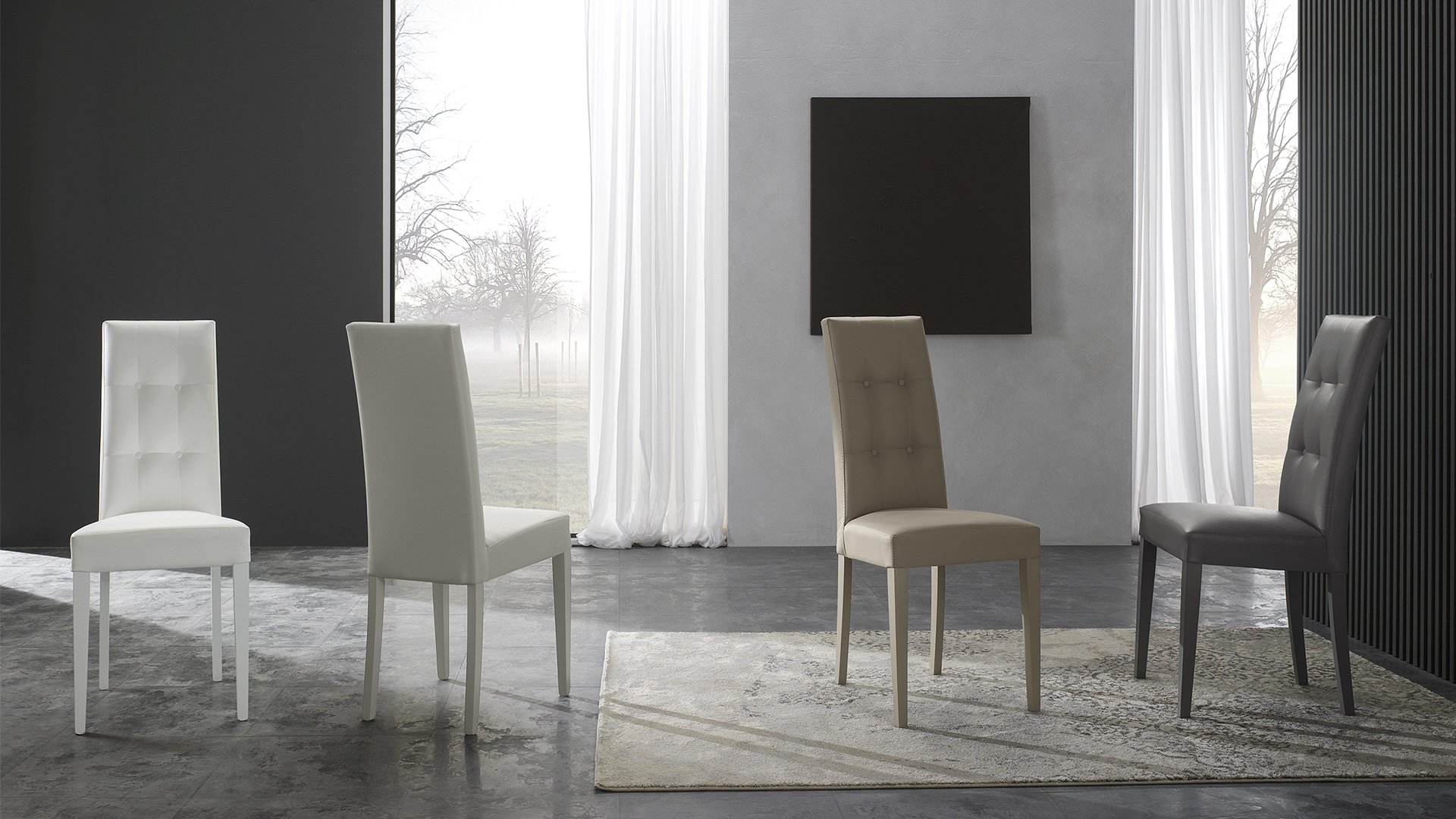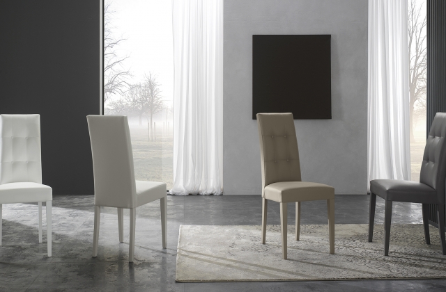 Sedia con struttura in legno verniciato e seduta rivestita in ecopelle, disponibile nei colori bianco, antracite, grigio tortora o cappuccino.