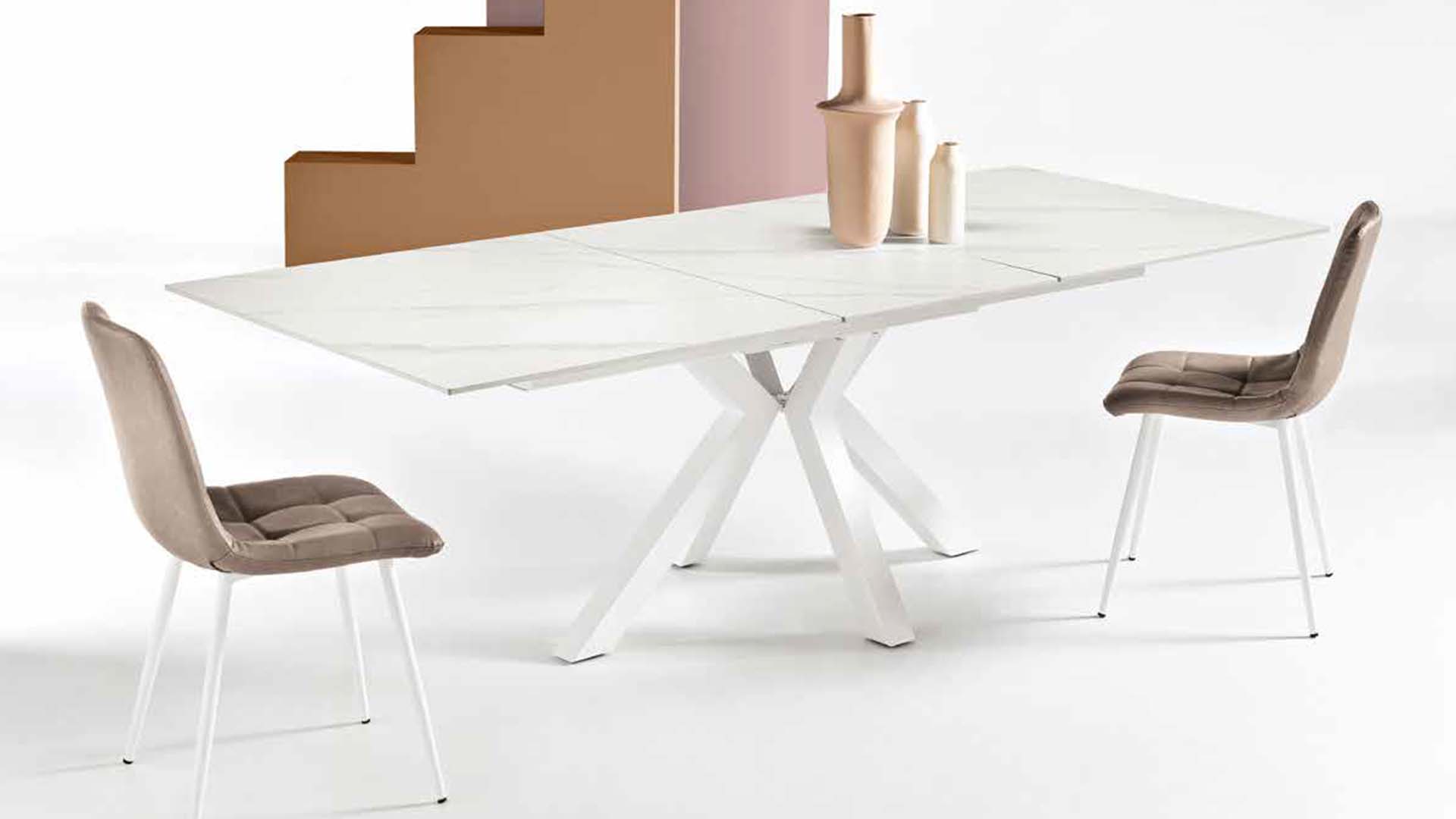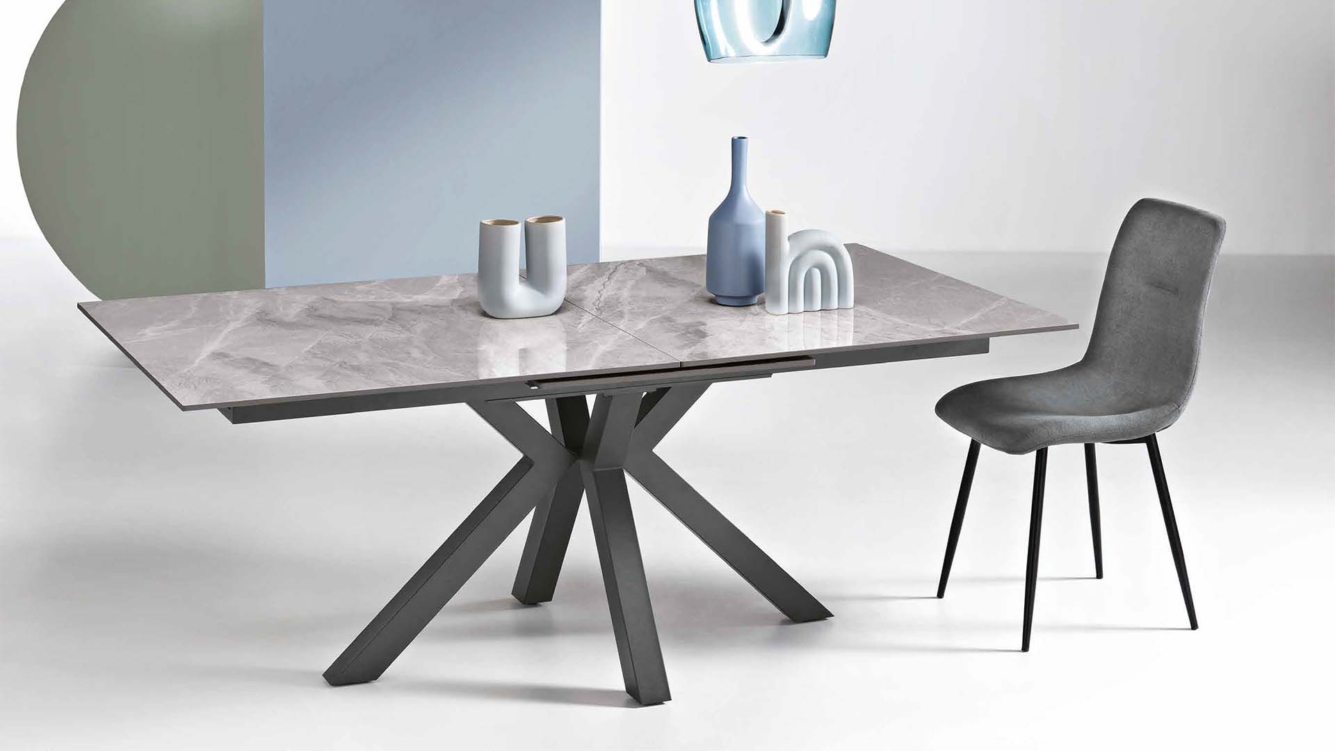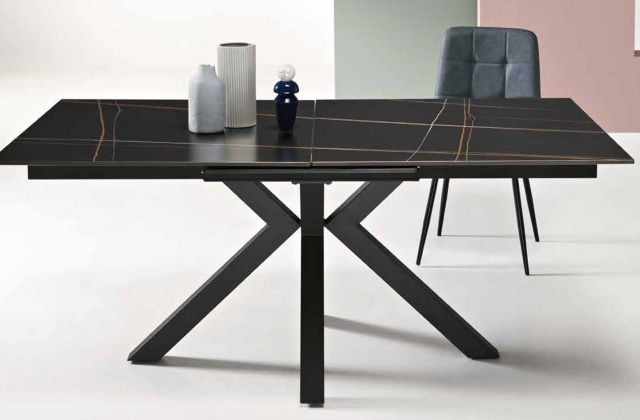Tavolo allungabile dal design moderno con piano effetto marmo scuro e venature eleganti.