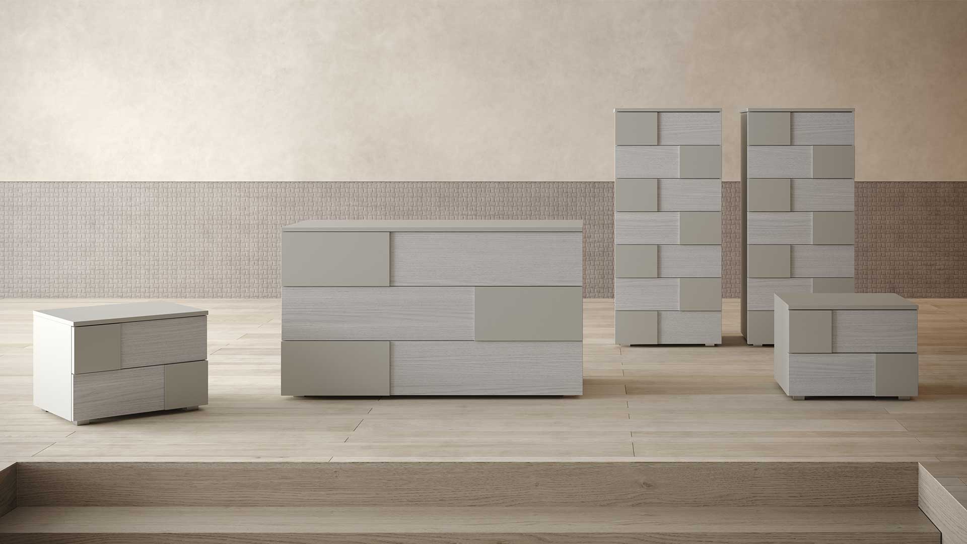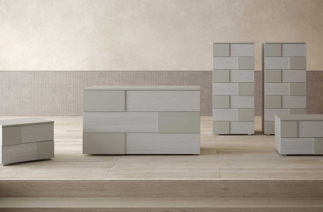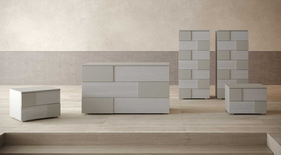 Libero e sognante, il gruppo notte Dobby è una composizione formata da un ampio comò, da pratici comodini ad uno o due cassetti e da un capiente settimino, in finitura laccato opaco Fango e nobilitato Opera. La composizione a mosaico realizzata sui pannelli dei frontali donano all'ambiente un atmosfera calma e onirica, perfetta per il tuo relax.