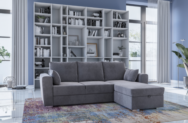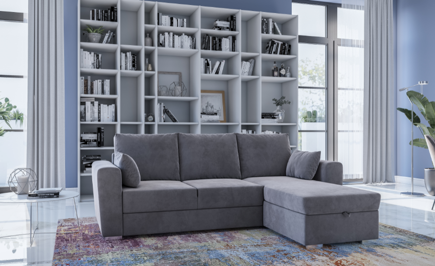 Domino è un divano parzialmente sfoderabile, con chaise long contenitore e letto a slitta. Disponibile in vari tessuti e colori.