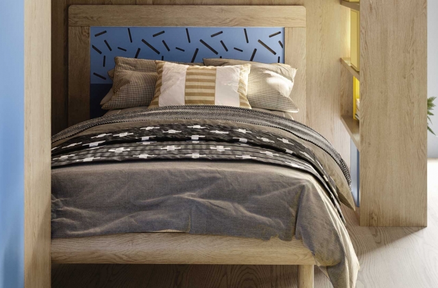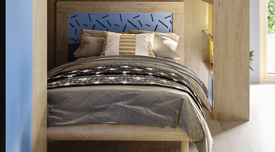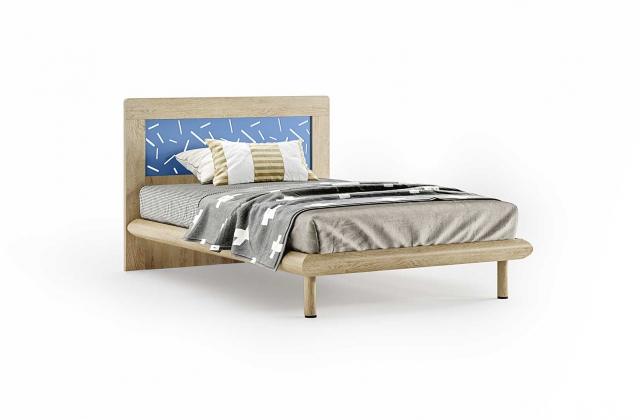 Il modello Duckbill è realizzato con testata e giroletto in pannello legno ed è disponibile in diverse finiture. Elemento caratterizzante è la particolare testata con elementi grafici creativi, disponibile in diversi colori, che donano alla camera vivacità e personalità.