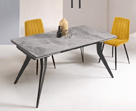 Pratico tavolo allungabile con due allunghe centrali da 40 cm per poter accogliere al meglio i comodi pranzi della domenica da passare con amici o parenti; le gambe sono realizzate in metallo verniciato, mentre il top è in pietra sinterizzata effetto marmo.