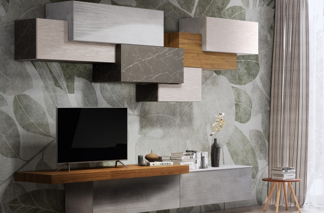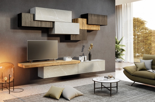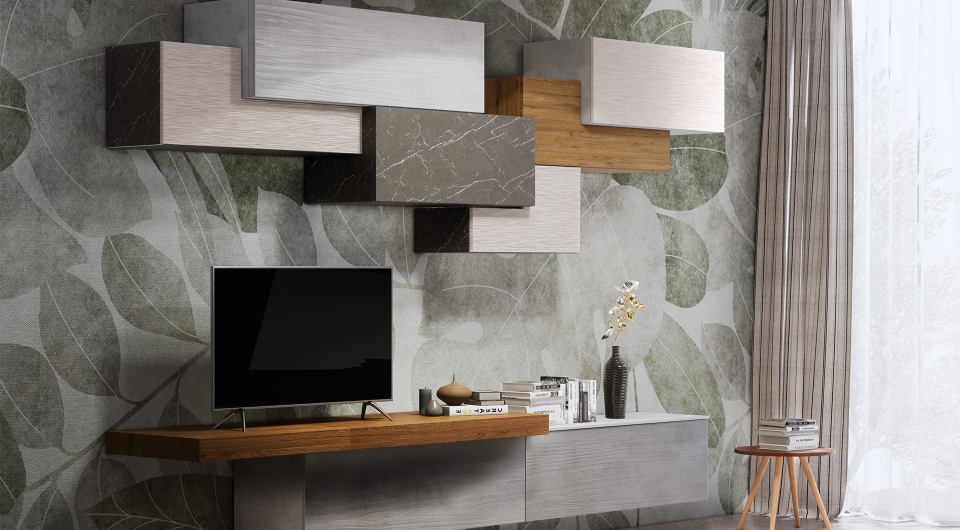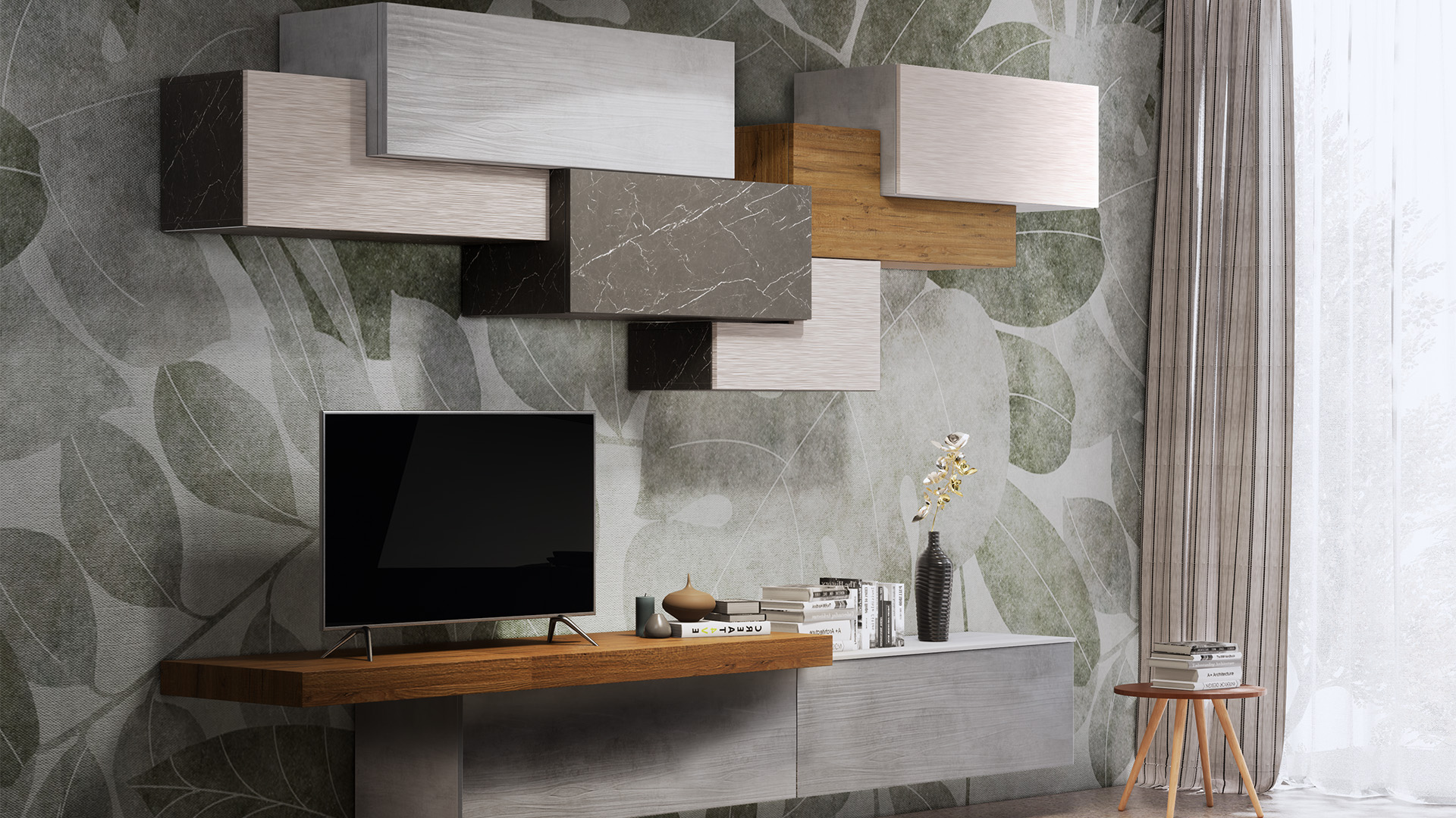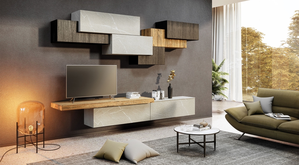 Elsa è un living dal disegno innovativo, caratterizzato da pensili di colori e profondità diverse che consentono di adattarsi a qualsiasi tipo di arredamento.