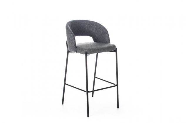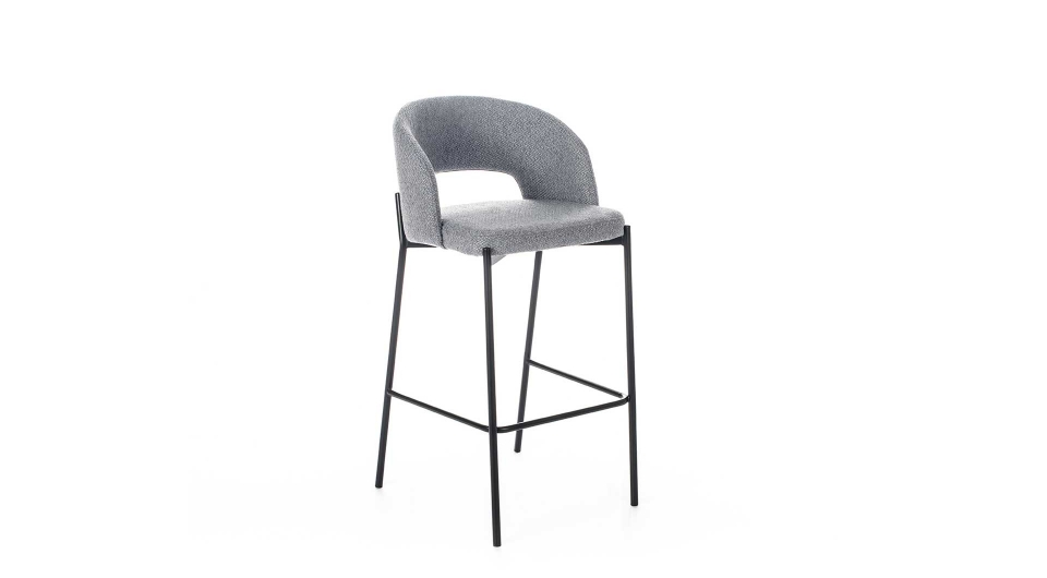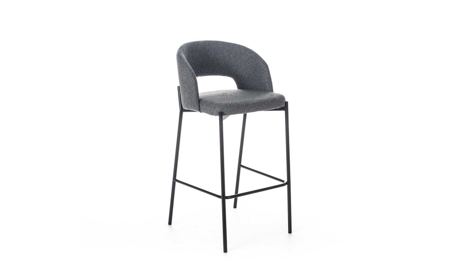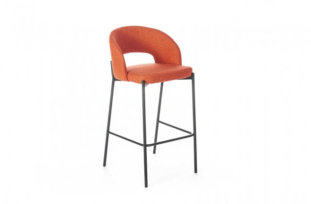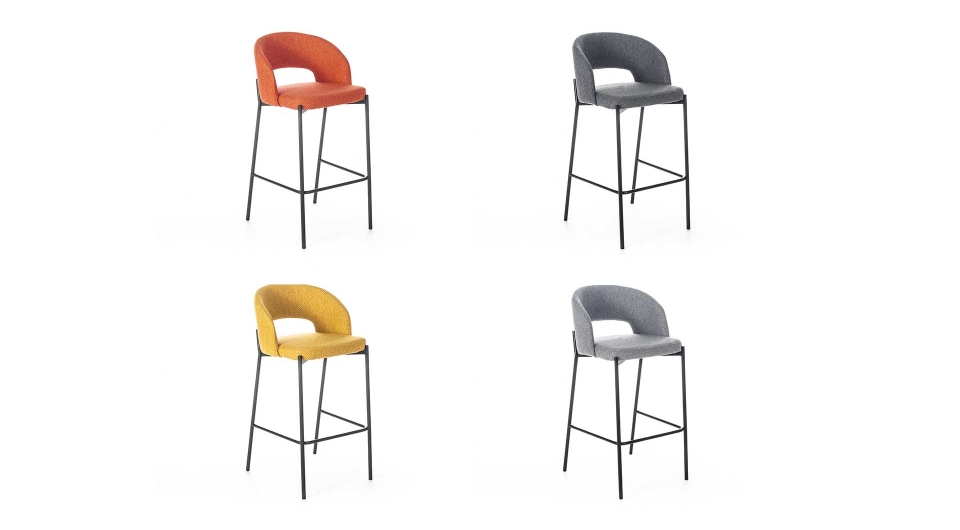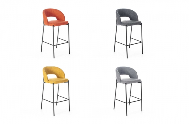 Sgabello con struttura in metallo verniciato e seduta in tessuto, disponibile in vari colori.