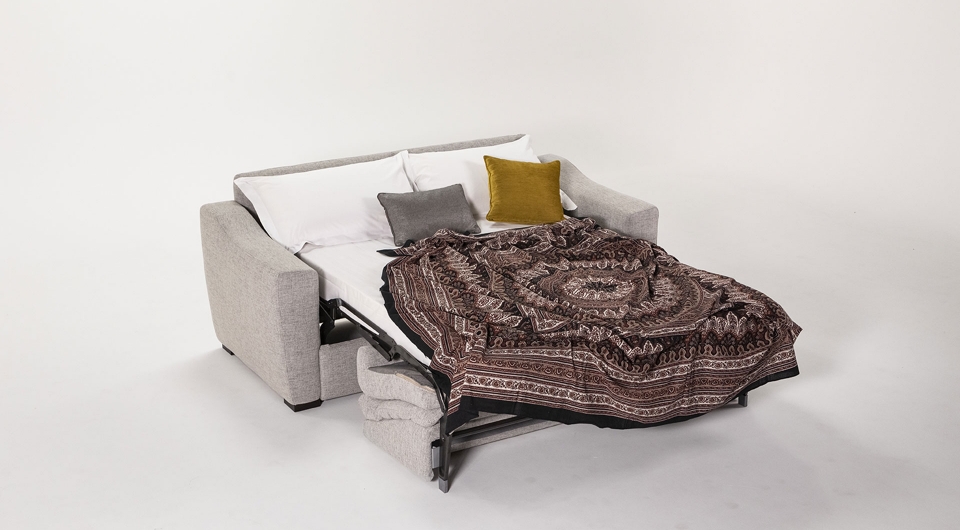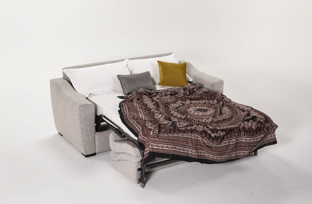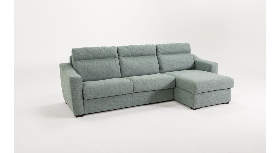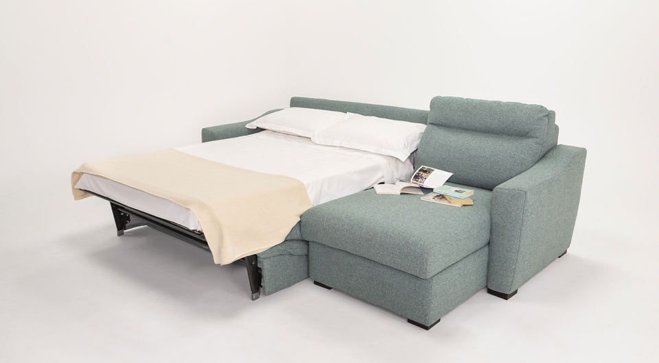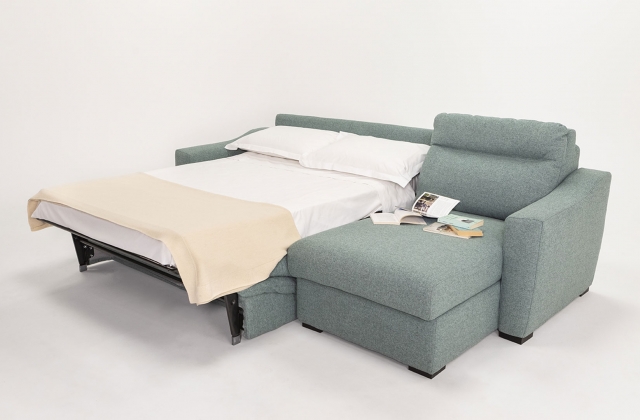 Il divano Formia è un modello versatile dotato di meccanismo a ribalta che lo rende in pochi passaggi un comodissimo letto con materasso H.17 incluso.