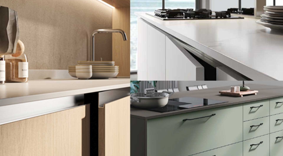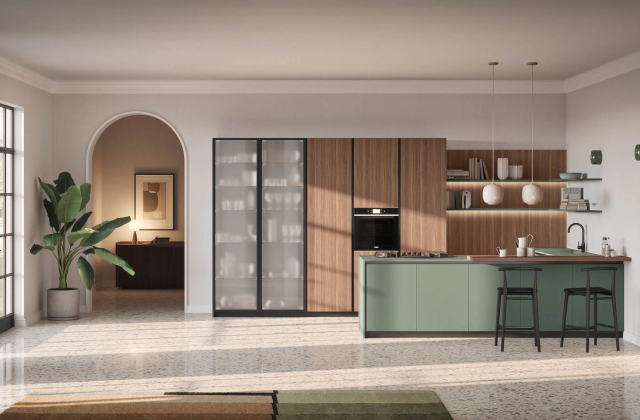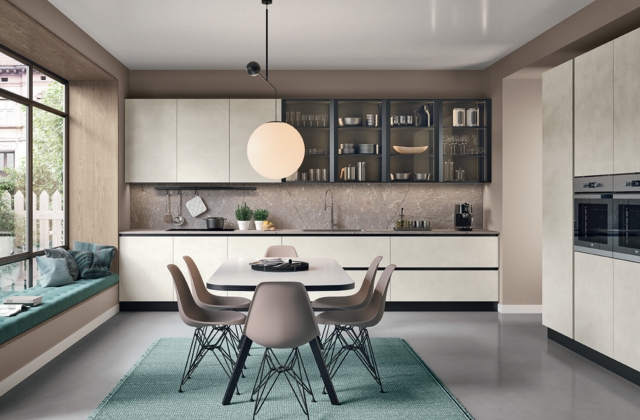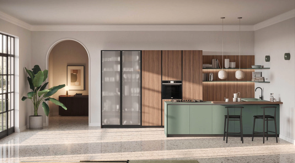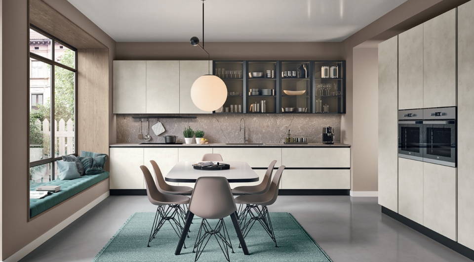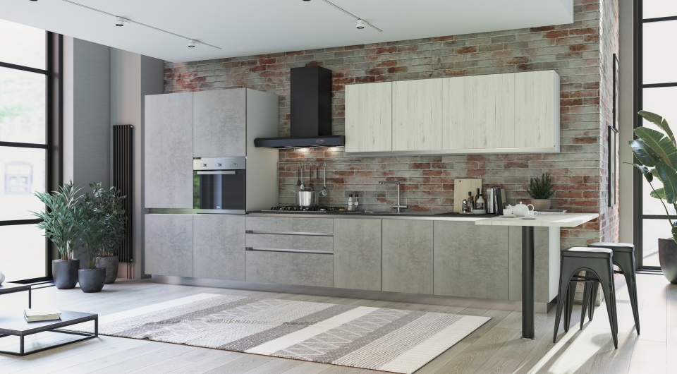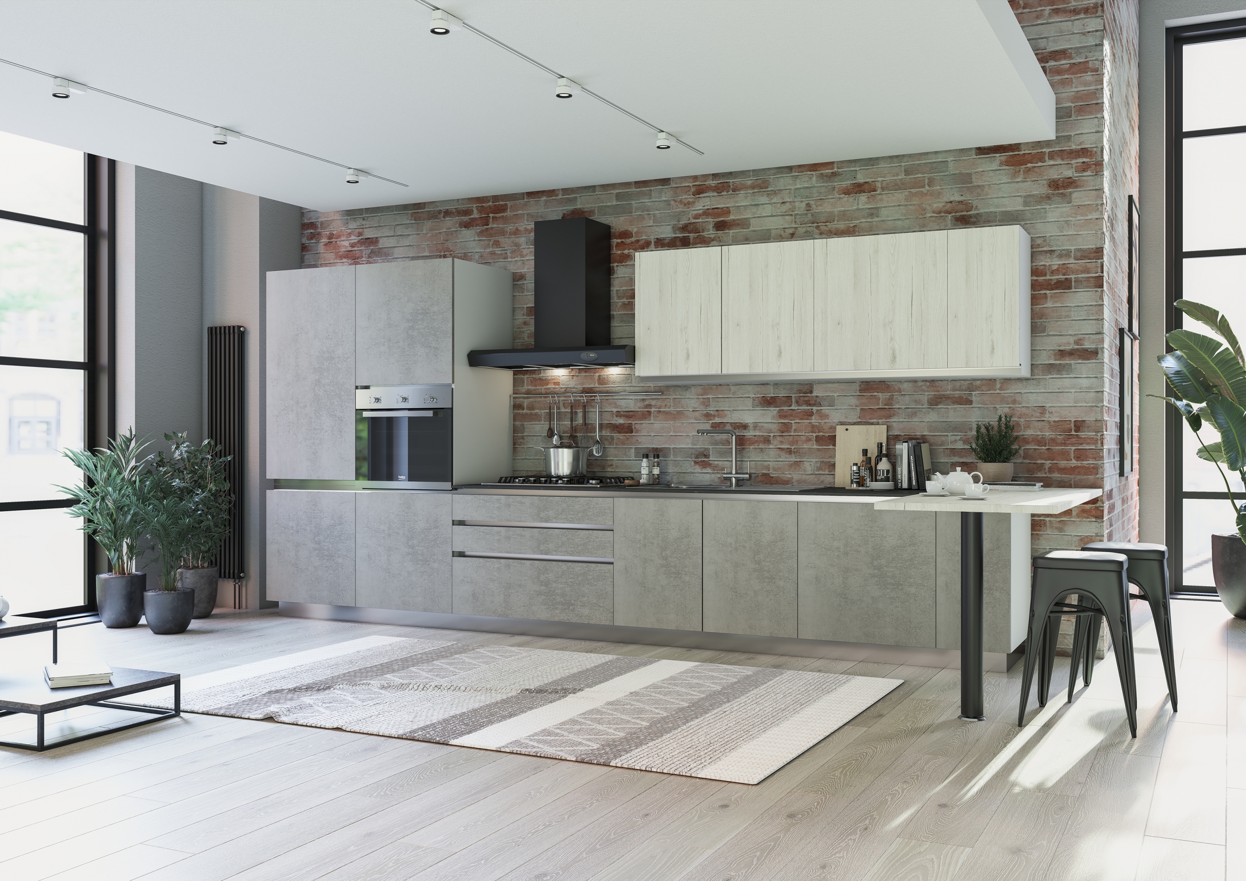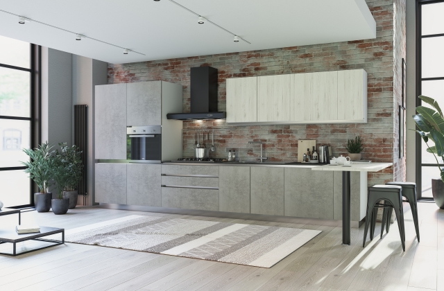 La cucina è disponibile in finiture effetto legno naturale, tinte unite raffinate, effetti spatolati e cementi moderni, perfette per creare un ambiente accogliente e di tendenza.
