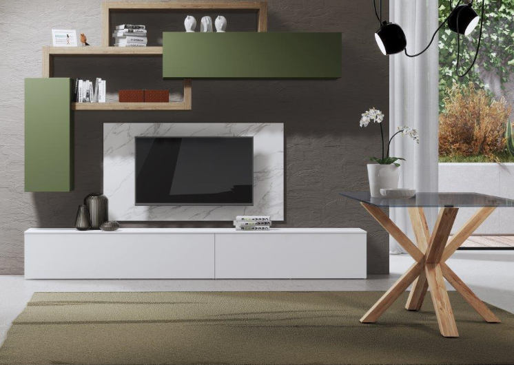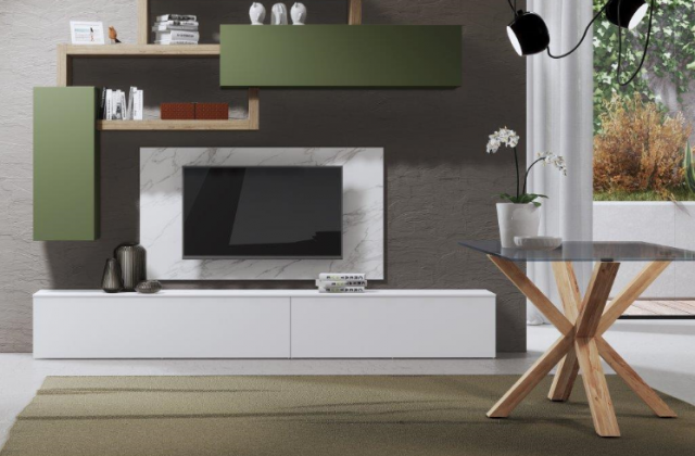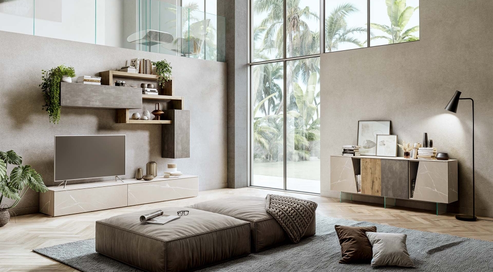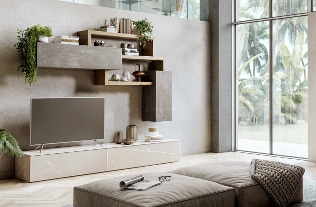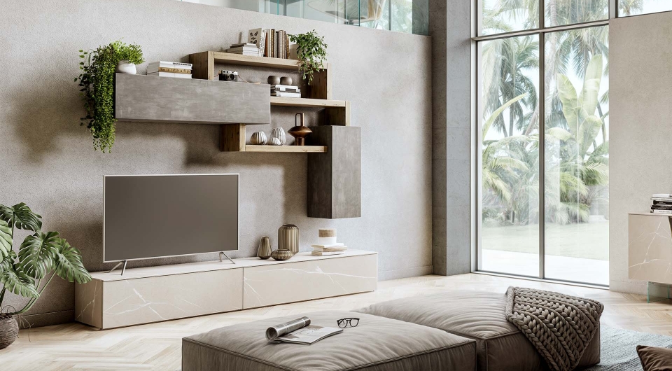 Componi tu la tua parete ridisegnando spazi e geometrie, aggiungendo librerie e vani a giorno e scegliendo le finiture più adatte al tuo soggiorno.