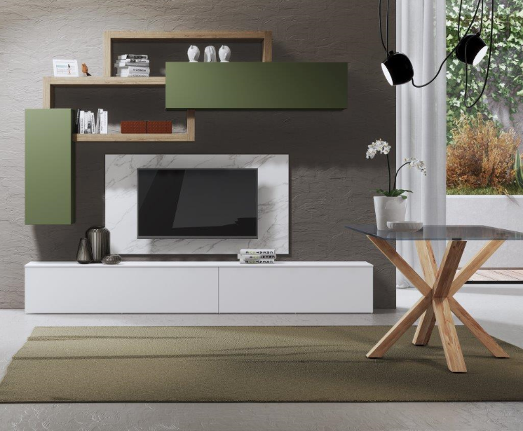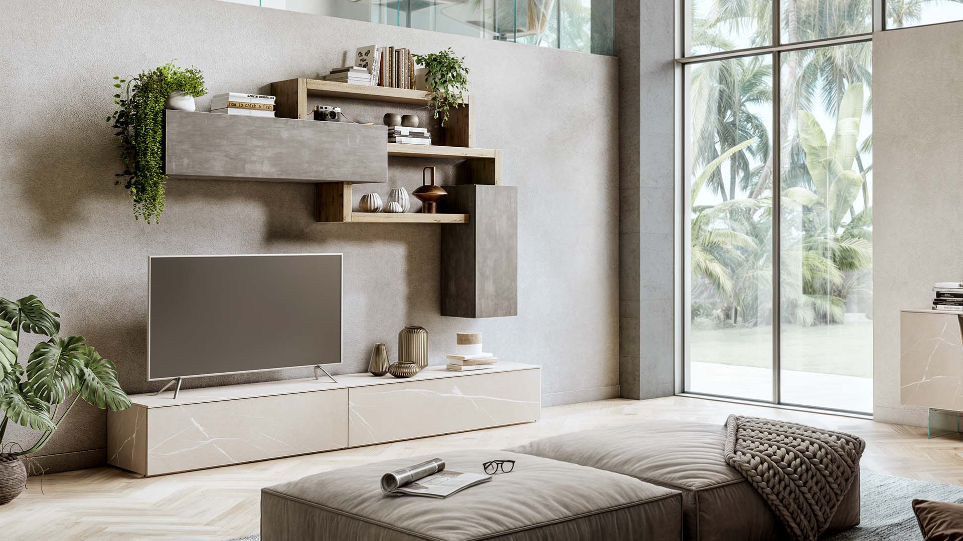Componi tu la tua parete ridisegnando spazi e geometrie, aggiungendo librerie e vani a giorno e scegliendo le finiture più adatte al tuo soggiorno.
