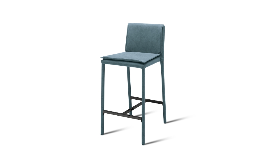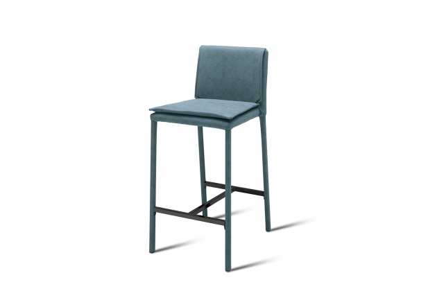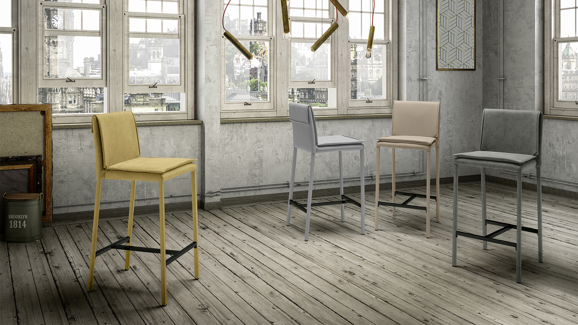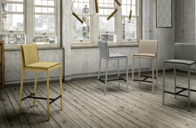 Sgabello con struttura in metallo, completamente rivestito in vari materiali e finiture.