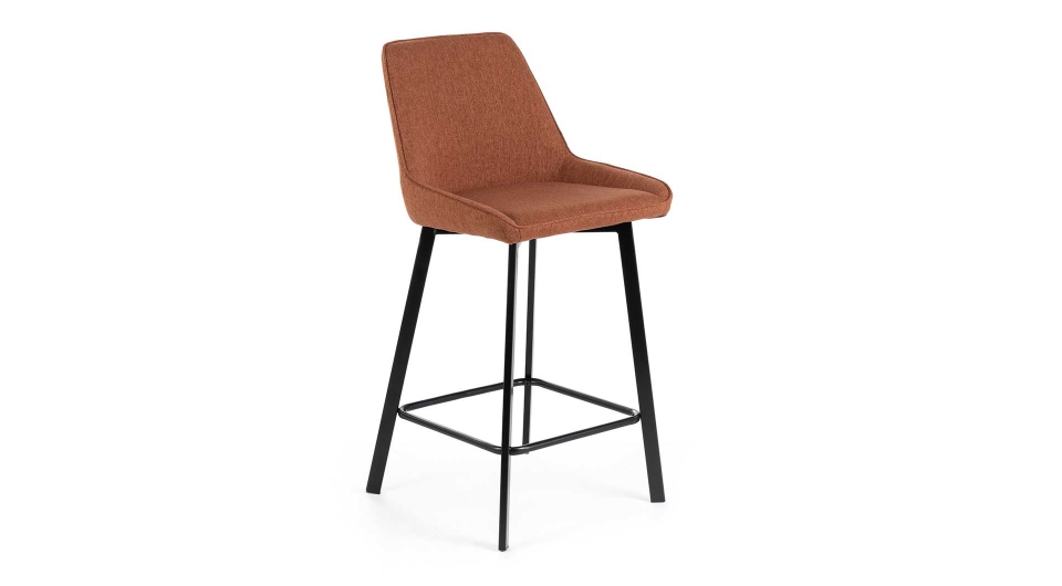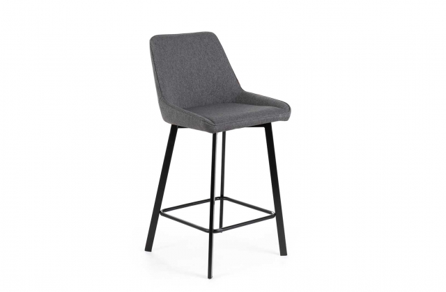 Sgabello con gambe in metallo e seduta imbottita rivestita in tessuto, disponibile in vari colori.