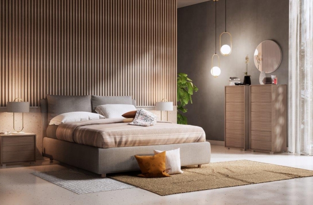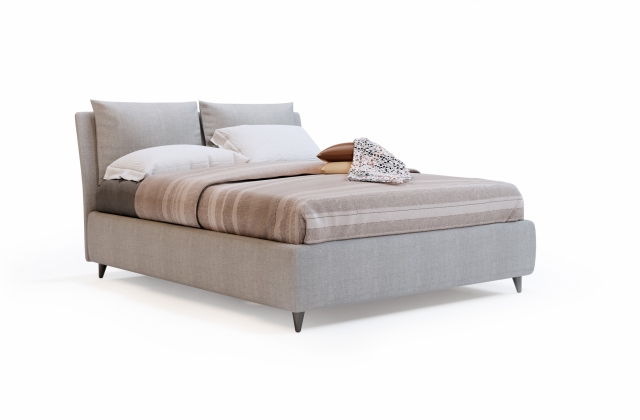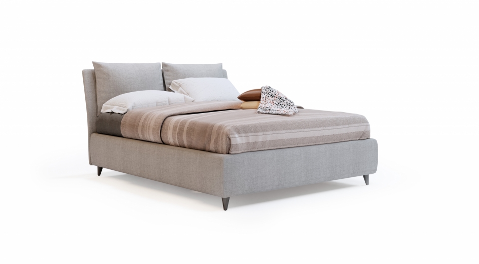 Ketlin è un letto che non tramonta mai. I due soffici cuscinotti della testata, leggermente più stretti rispetto al pannello della testiera, sembrano incastonati alla perfezione nei volumi del letto.