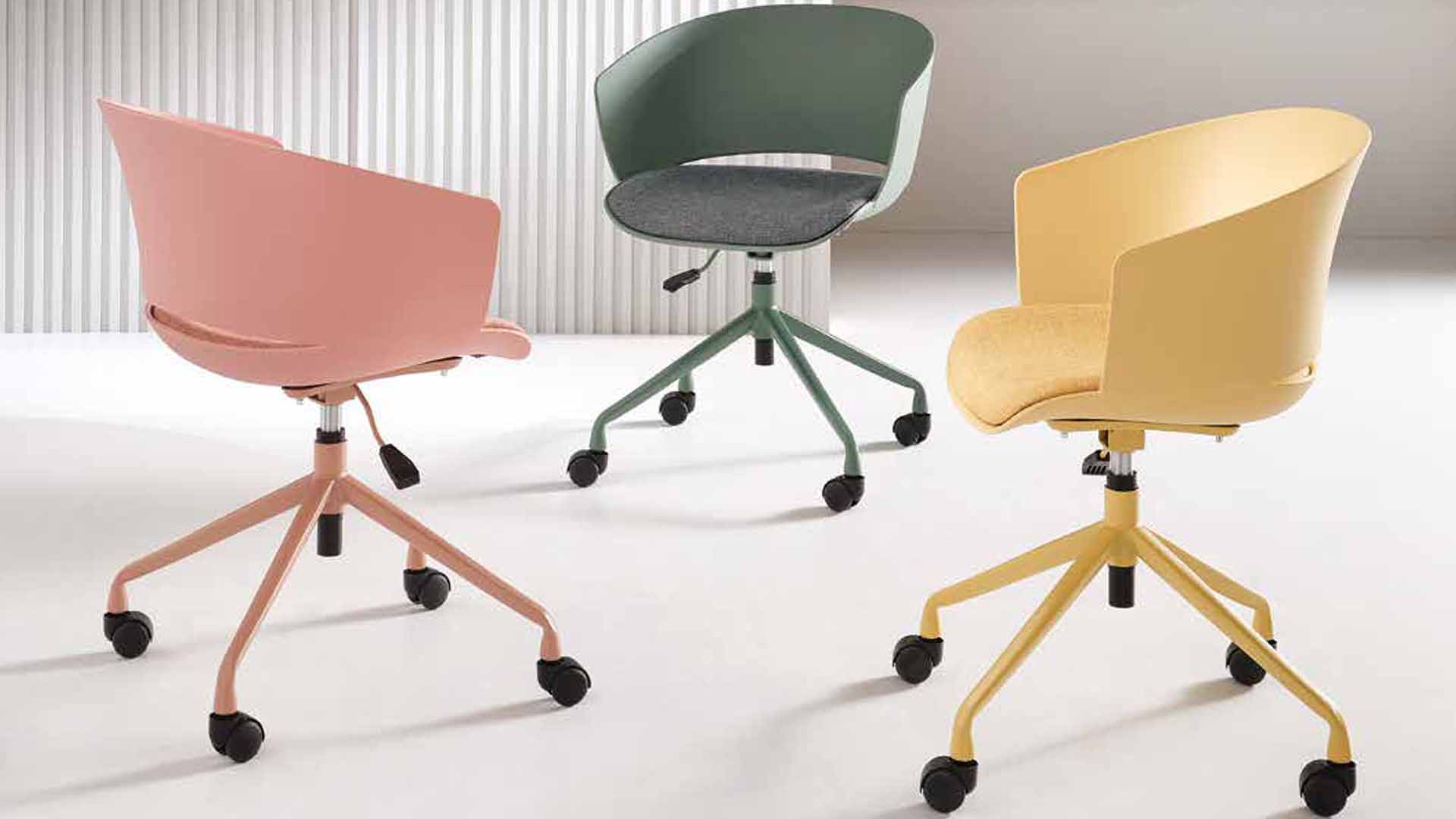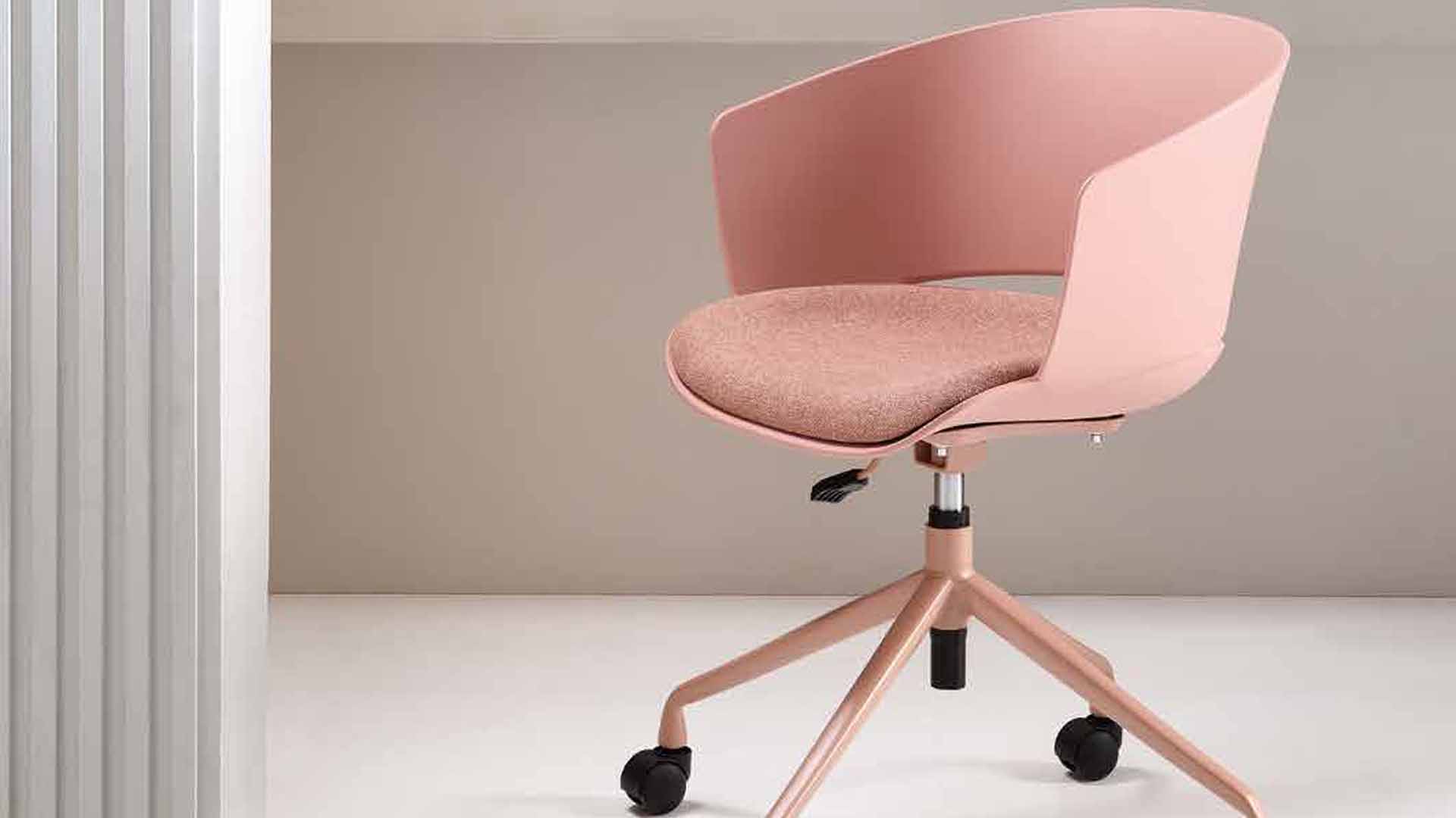 Sedia girevole 360° con seduta imbottita in tessuto e struttura in metallo verniciato.