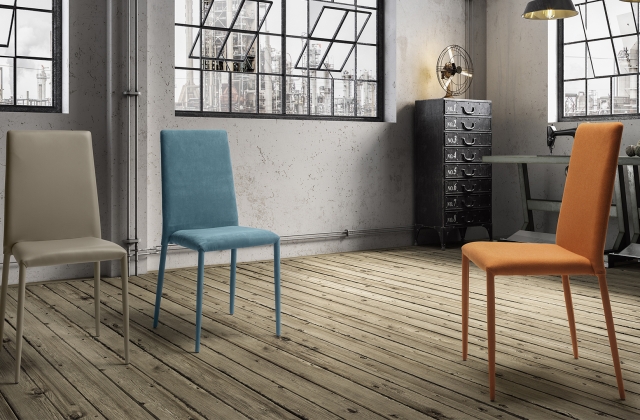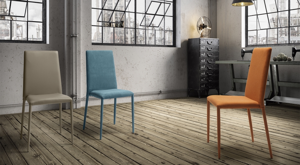 Sedia con struttura in metallo, completamente rivestita in vari materiali e finiture.
