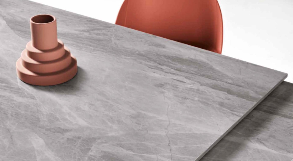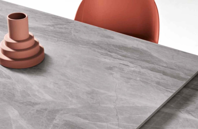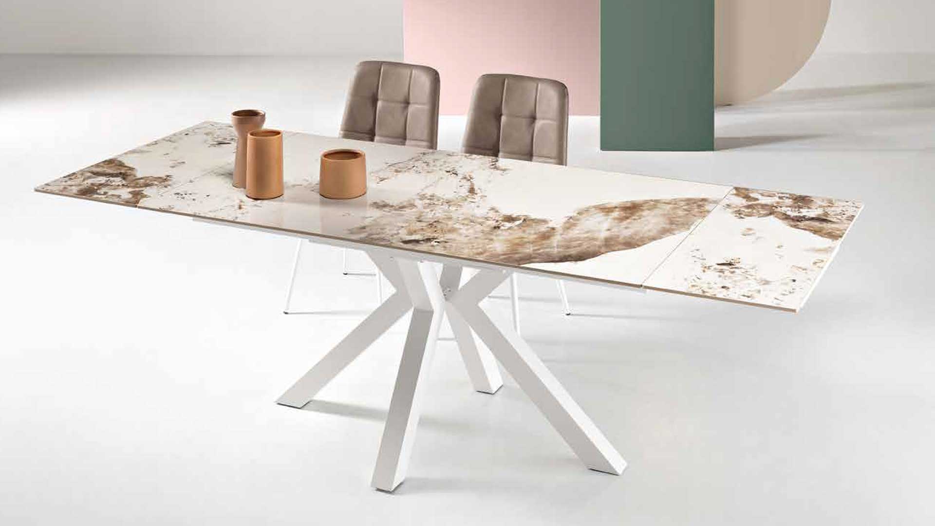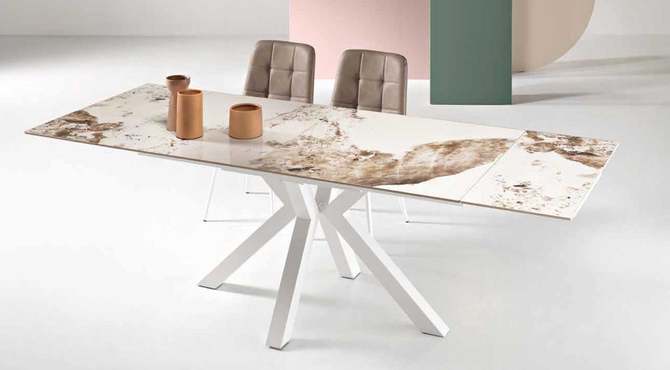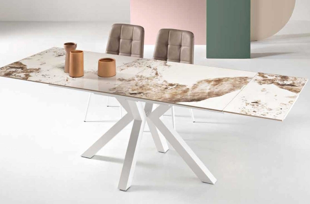 La struttura si accompagna ad un piano in pietra sinterizzata effetto marmo con due allunghe laterali da 40 cm che lo rendono molto versatile e adatto ad accogliere numerosi invitati.
