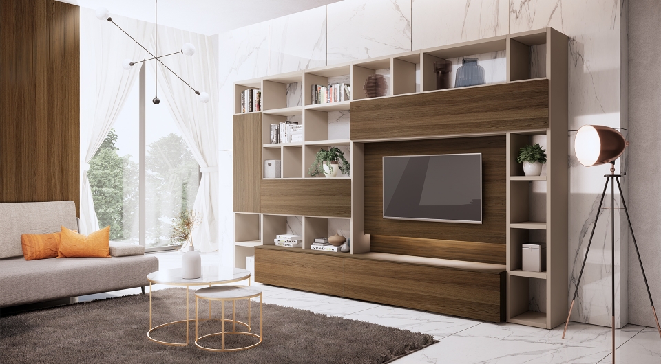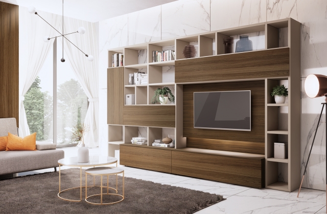 Una composizione che, grazie alla combinazione di vari moduli, riesce a sfruttare tutto lo spazio a disposizione e a dare carattere e personalità al tuo living.