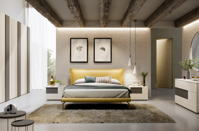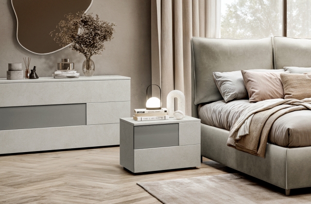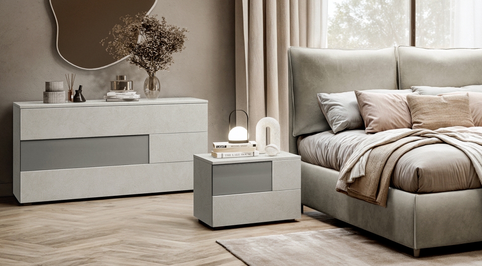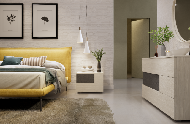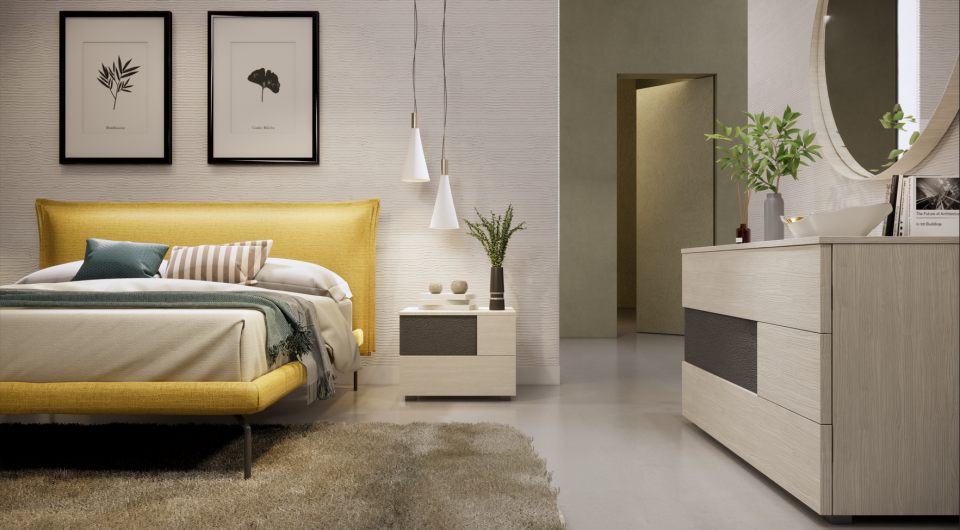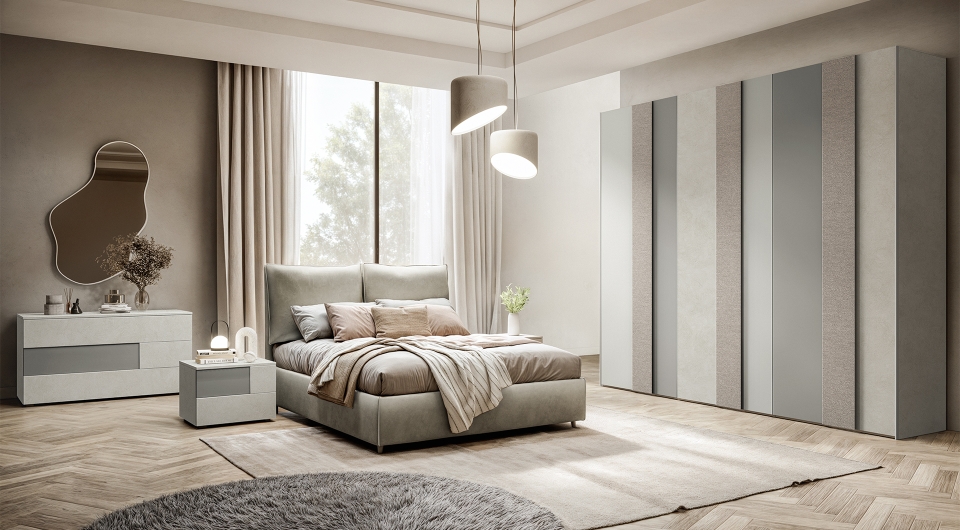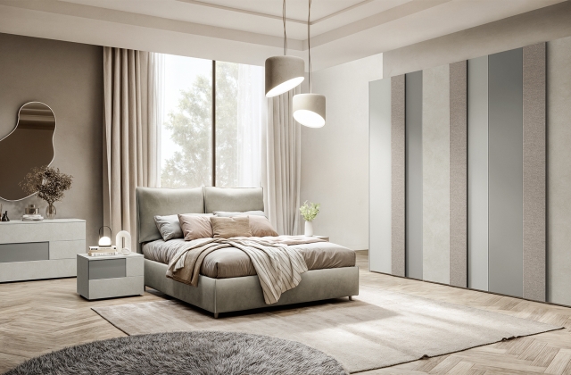I colori tenui del letto Sofy, realizzato con testata e giroletto sfoderabili, donano un'aria di tranquillità alla camera, mentre le finiture nobilitato cenere wood e stone grey scelte per l'armadio Maxi e il per gruppo Jobel riequilibrano i toni dell'ambiente, realizzando una camera dal respiro rilassante e adatta ad accompagnarti verso il meritato riposo serale.