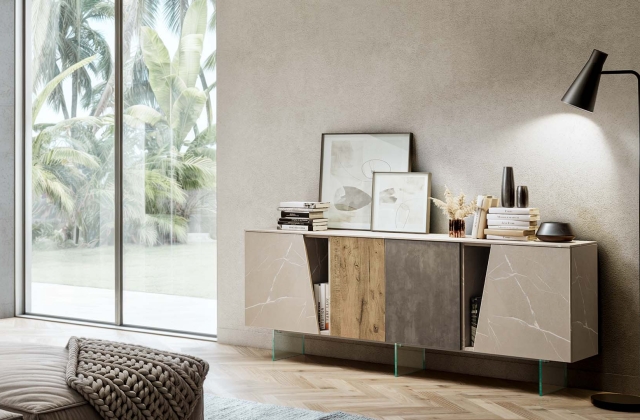 Le ante asimmetriche con finiture pregiate conferiscono un look esclusivo, mentre la base in vetro trasparente dona leggerezza visiva, facendo sembrare il mobile quasi sospeso.