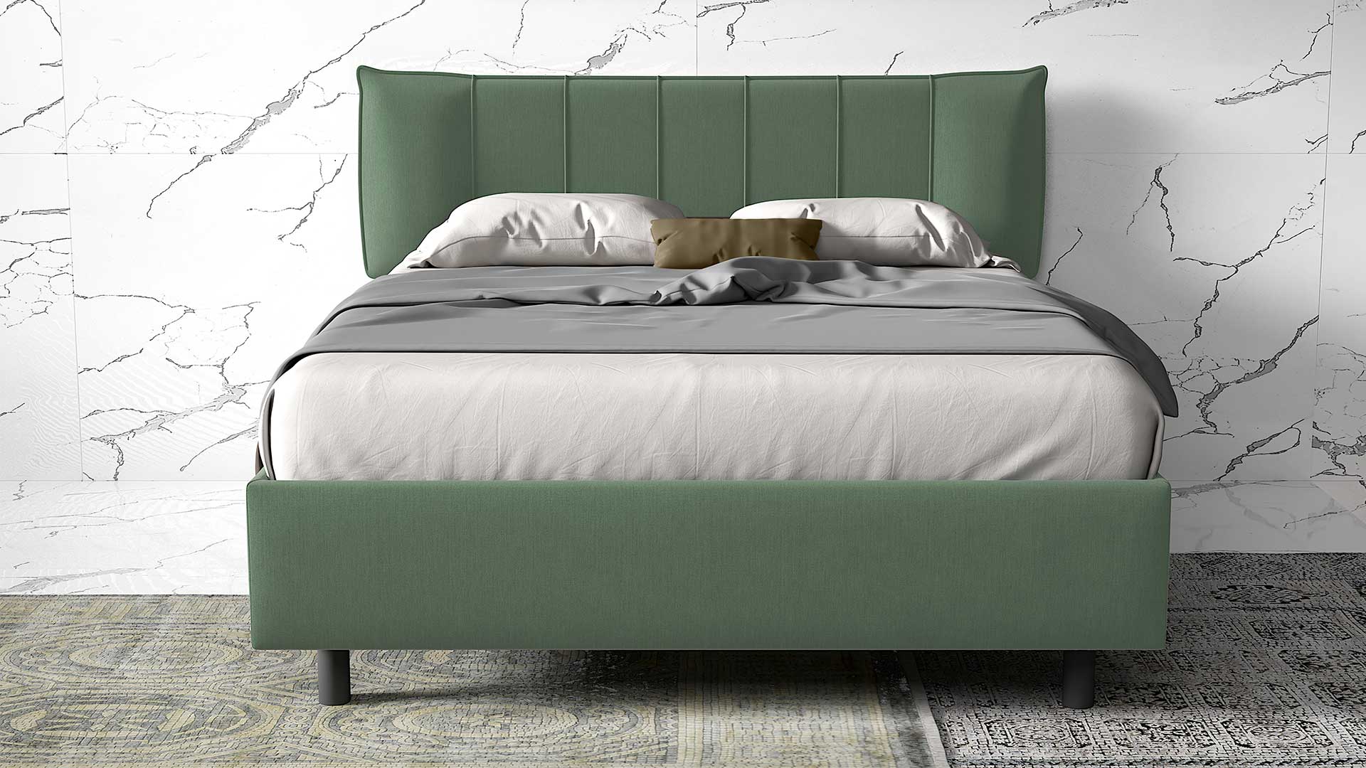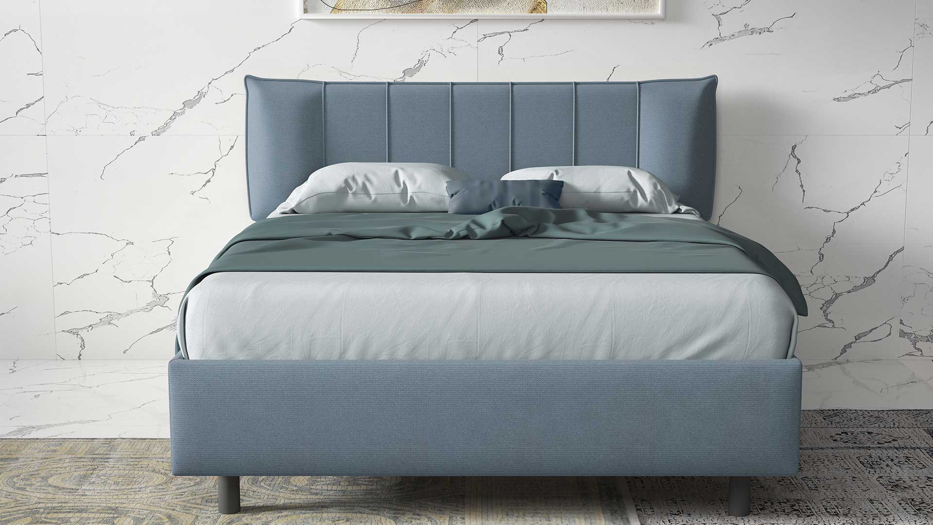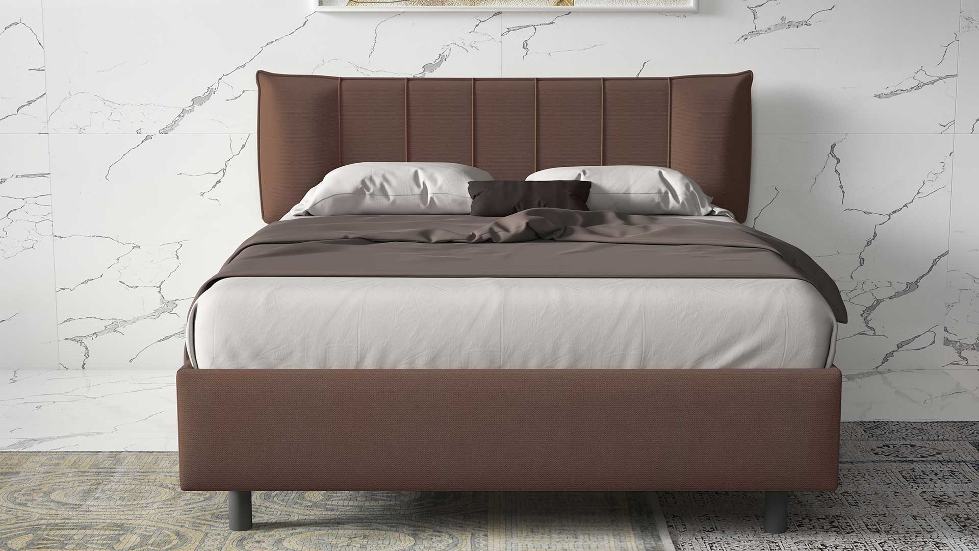 Dotato di contenitore, il letto Michela si compone di testata e giroletto imbottiti disponibili in vari tessuti e colori.