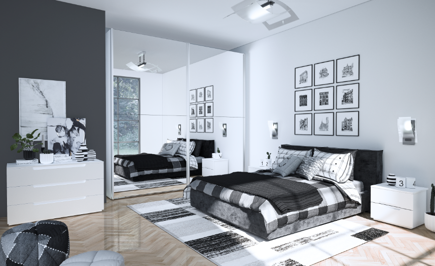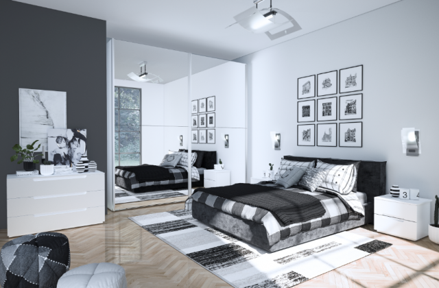 La camera da letto è il nostro spazio intimo e personale, il luogo dove ritrovare se stessi ed abbandonarsi serenamente al puro relax rigenerante della notte. L’eleganza e la delicatezza del bianco caratterizzano questo ambiente valorizzato dalle illusioni visive create dalla presenza delle ante scorrevoli a specchio in grado di riflettere e modificare la percezione dello spazio restituendoci la suggestione di una stanza ancora più spaziosa e luminosa. Il letto è una soffice nuvola avvolgente, personalizzabile nei colori e corredato dal comodo vano contenitore portaoggetti. Completano la composizione il pratico e spazioso comò e i comodini con anta gola e guide cassetti ammortizzate. La stanza ideale per il tuo riposo.