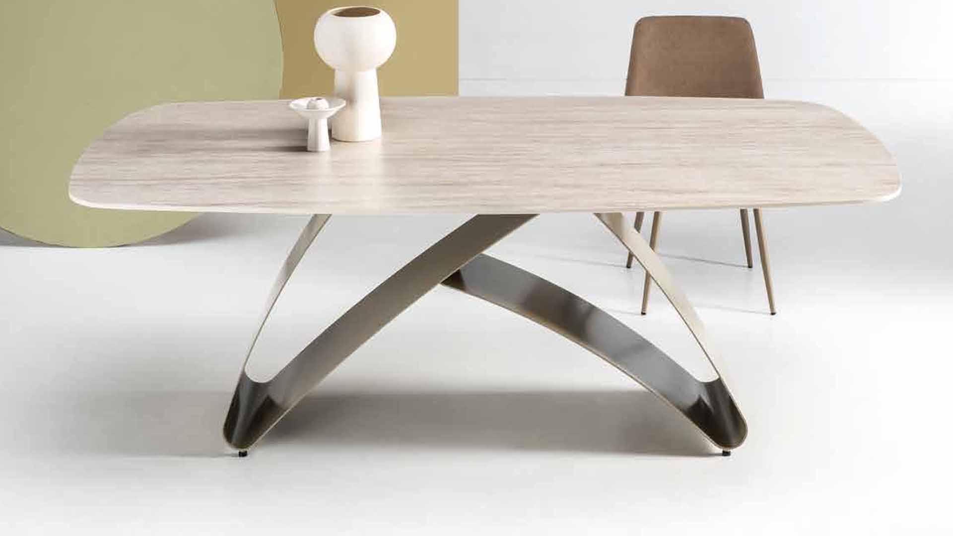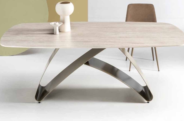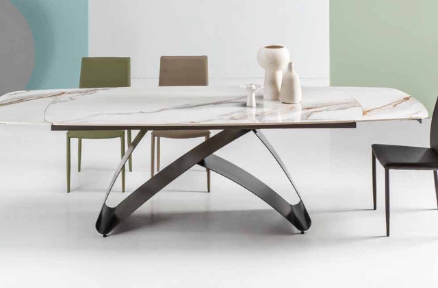 Tavolo 160x90 cm allungabile a 240 cm, piano e allunghe in nobilitato. Basamento in metallo. 8 finiture disponibili.