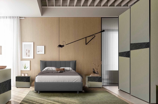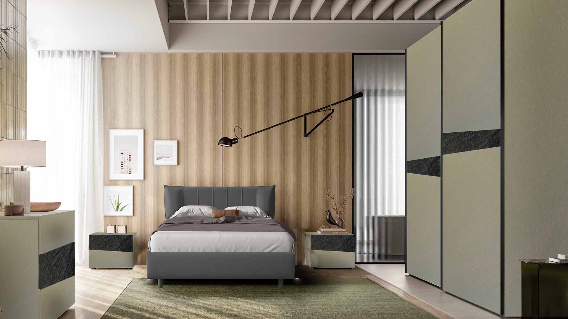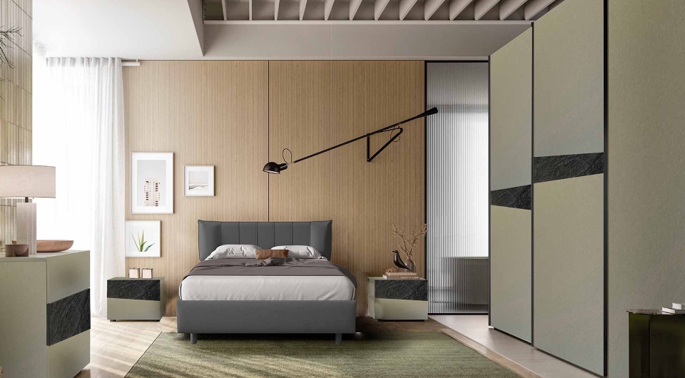 Questa elegante camera da letto moderna è la soluzione perfetta per chi cerca uno stile raffinato e funzionale. La composizione include un armadio a 2 ante scorrevoli dalle dimensioni generose L.275,1 x P.65,3 x H.253 cm, ideale per ottimizzare lo spazio con praticità senza rinunciare al design. Le ante scorrevoli, in finitura materica con inserti a contrasto, donano un look pulito e contemporaneo all’ambiente.