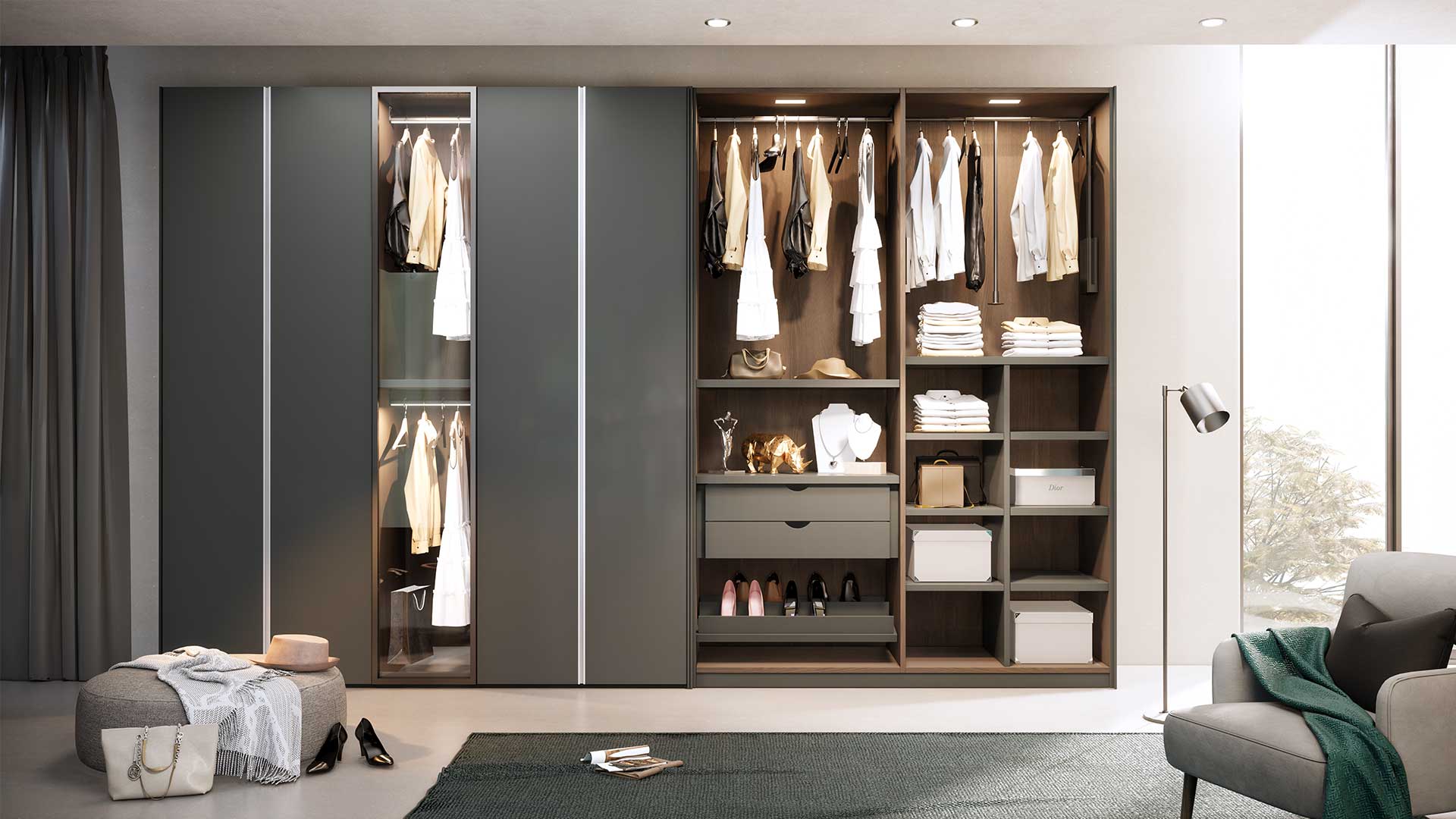 Cabina armadio con struttura e accessori in finitura titanio, New Pacifico è  una soluzione funzionale, ideale per chi vuole creare nella propria camera uno spazio completamente su misura.