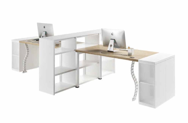 Realizzata con un piano in legno chiaro e una solida struttura bianca, offre un ampio spazio di lavoro ideale per postazioni multiple.