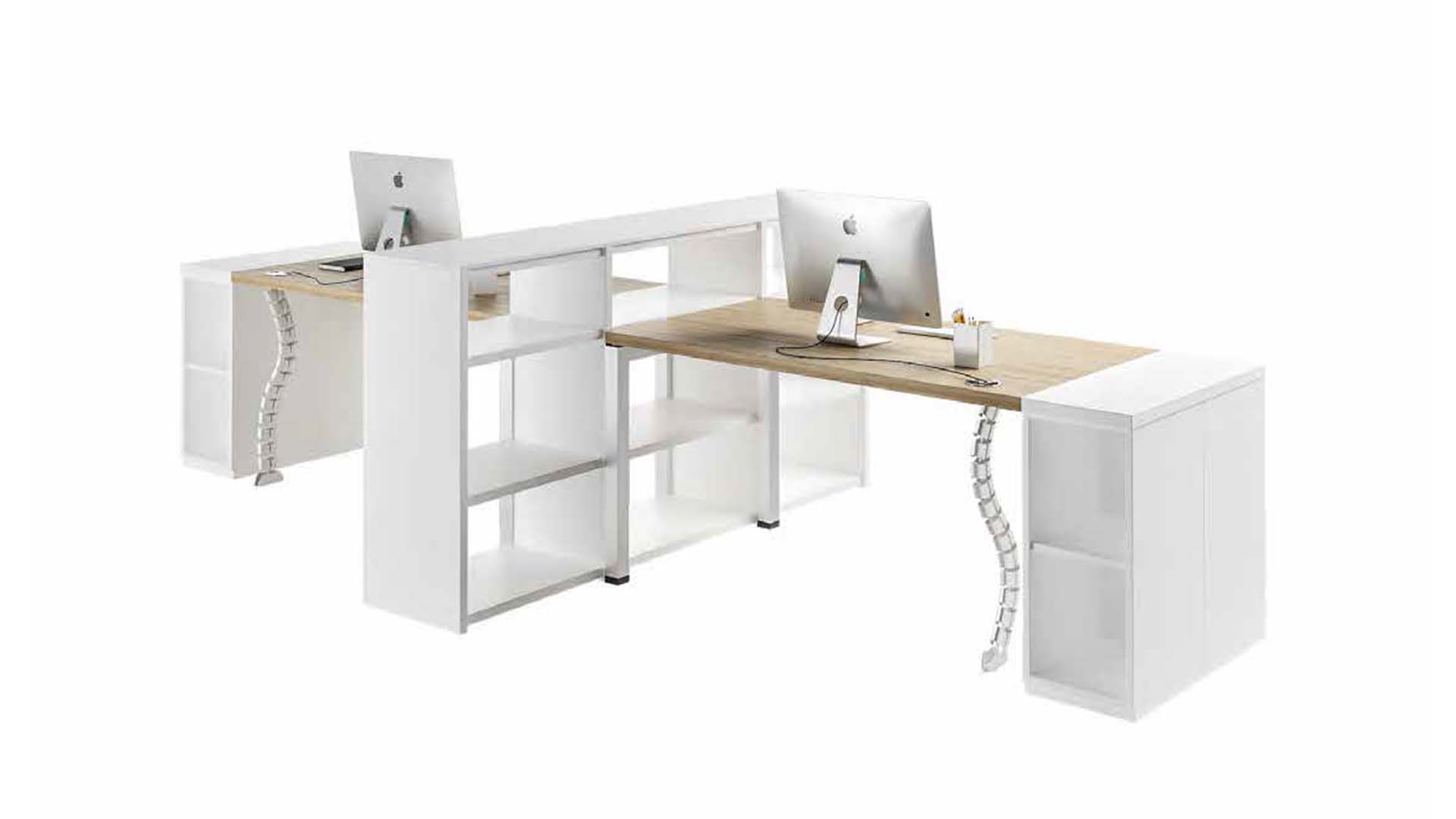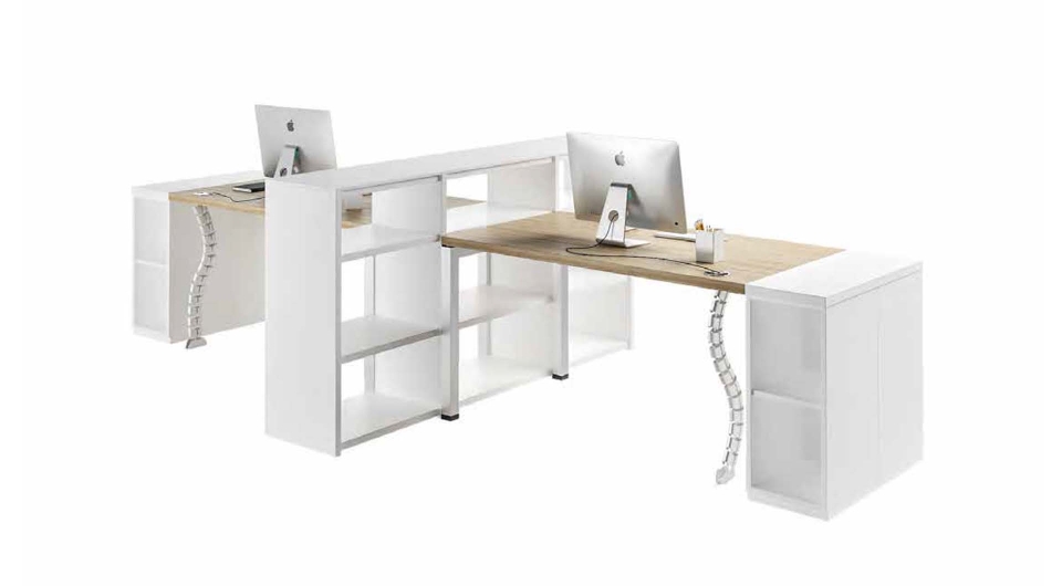 La scrivania può essere dotata di scaffali integrati, perfetti per organizzare documenti, libri e accessori, mantenendo l'ambiente ordinato e professionale.