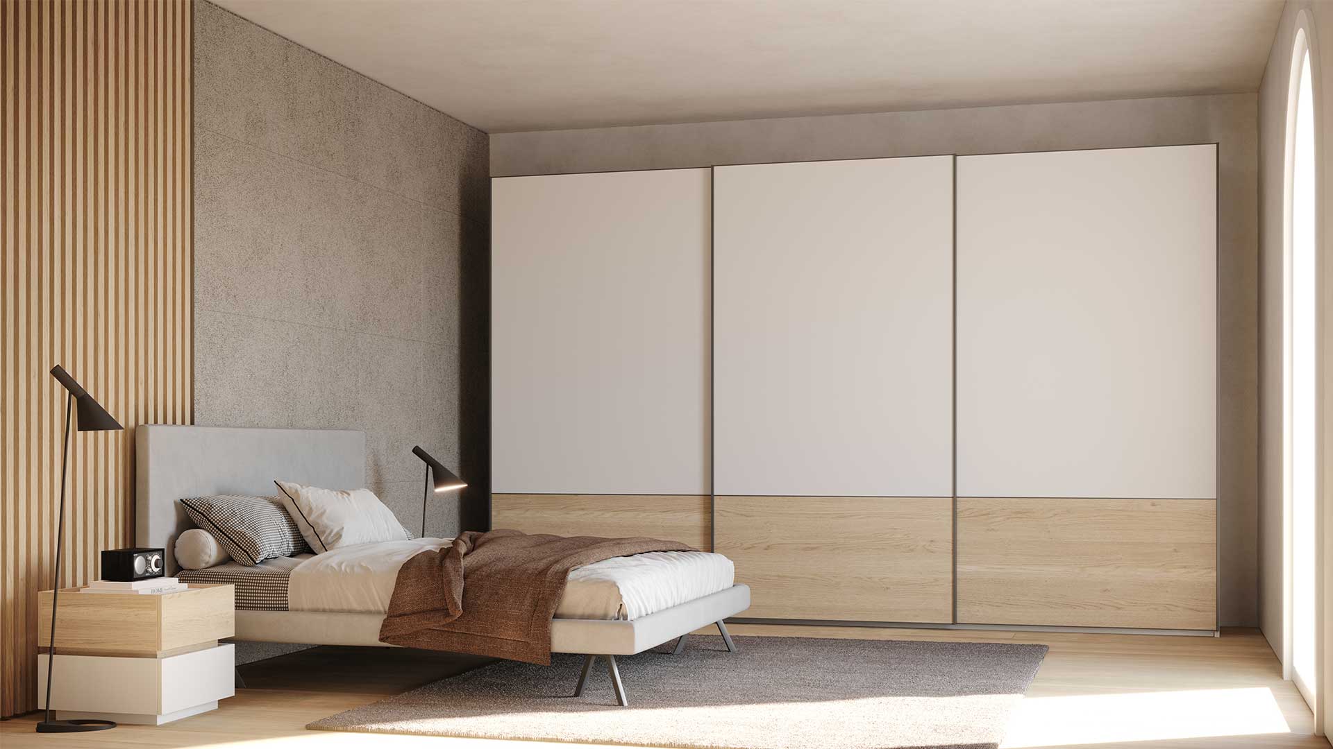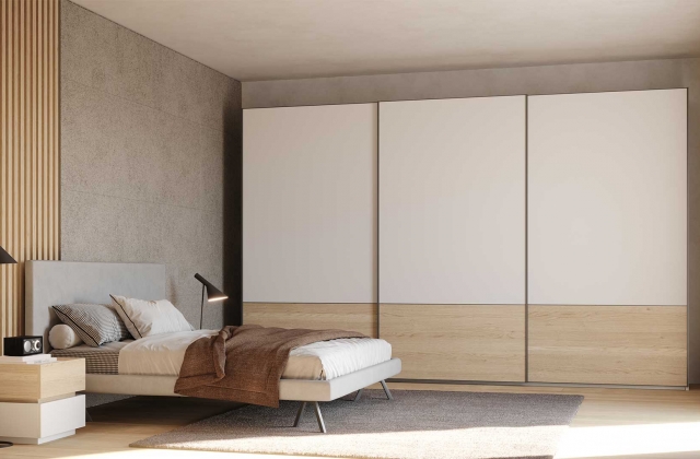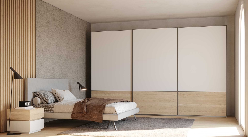Lineare e funzionale, senza maniglie, le sue ante scorrevoli in laccato opaco bianco sono arricchite da una fascia in nobilitato rovere che donano un carattere ricercato e non scontato al modello.