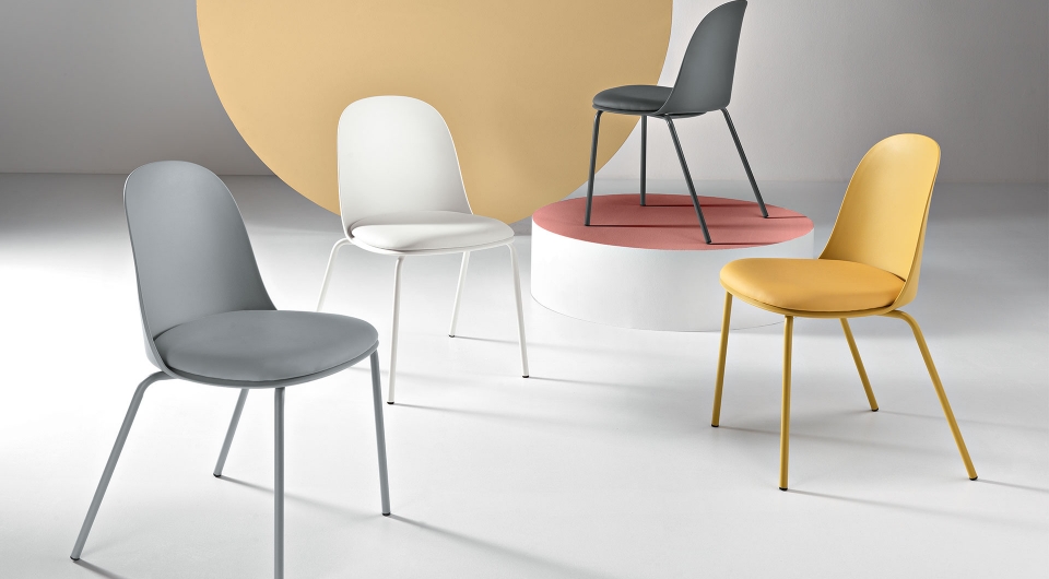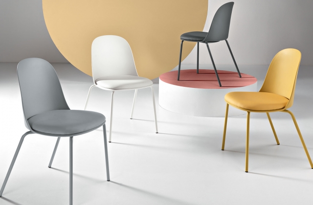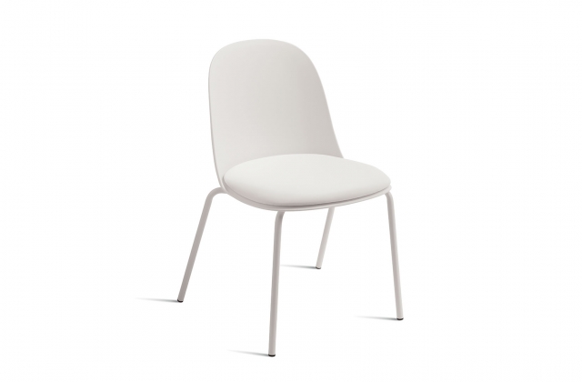 Sedia impilabile realizzata in polipropilene, con gambe in metallo verniciato e seduta imbottita rivestita in ecopelle, disponibile in diversi colori.