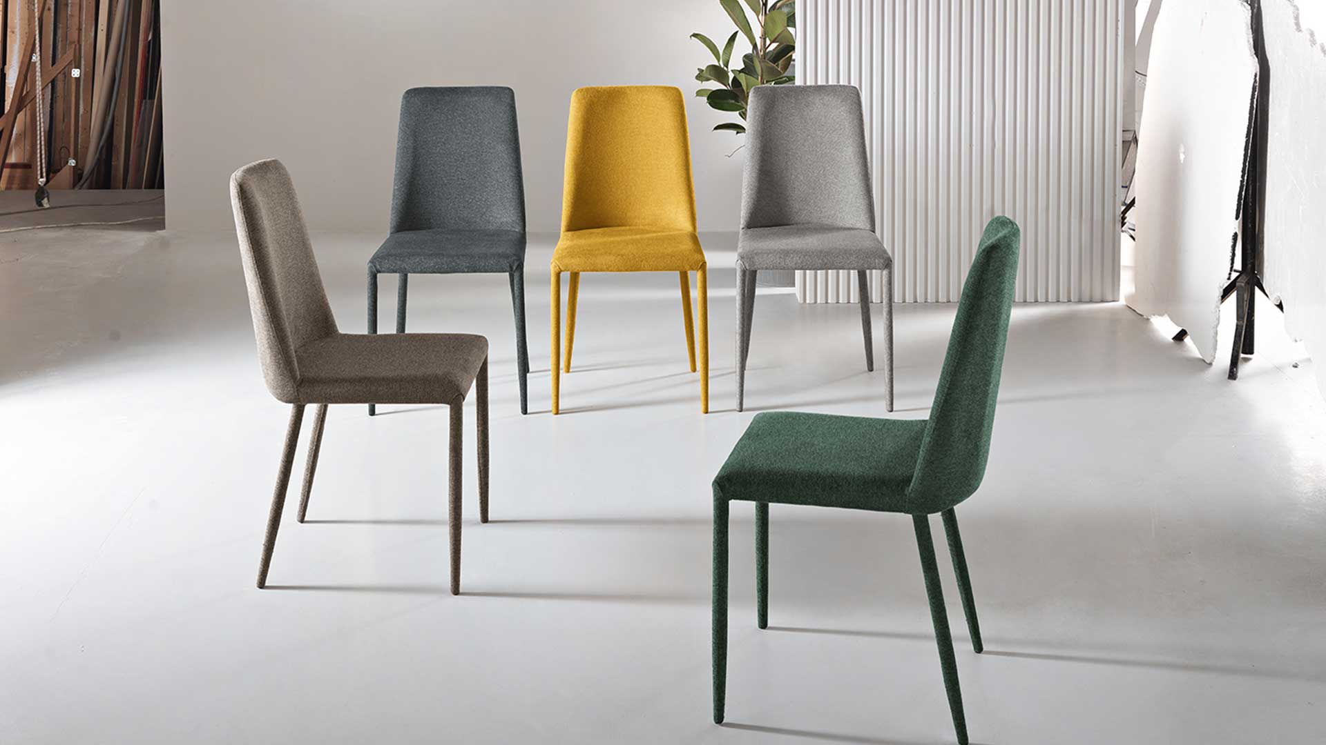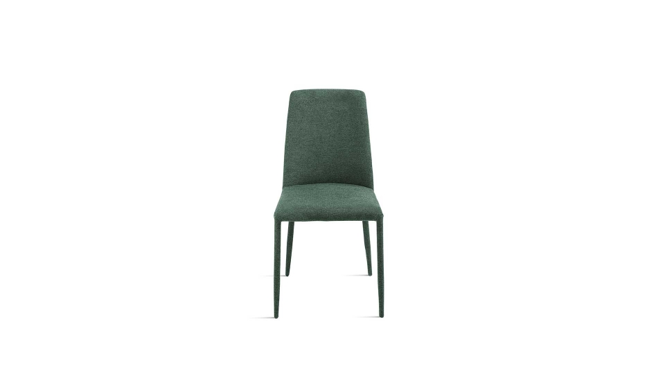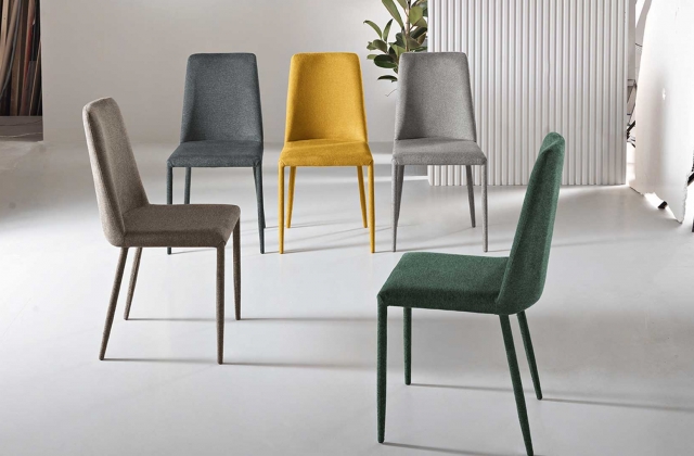 Sedia in tessuto, imbottita, con gambe rivestite in tessuto, disponibile in vari colori.