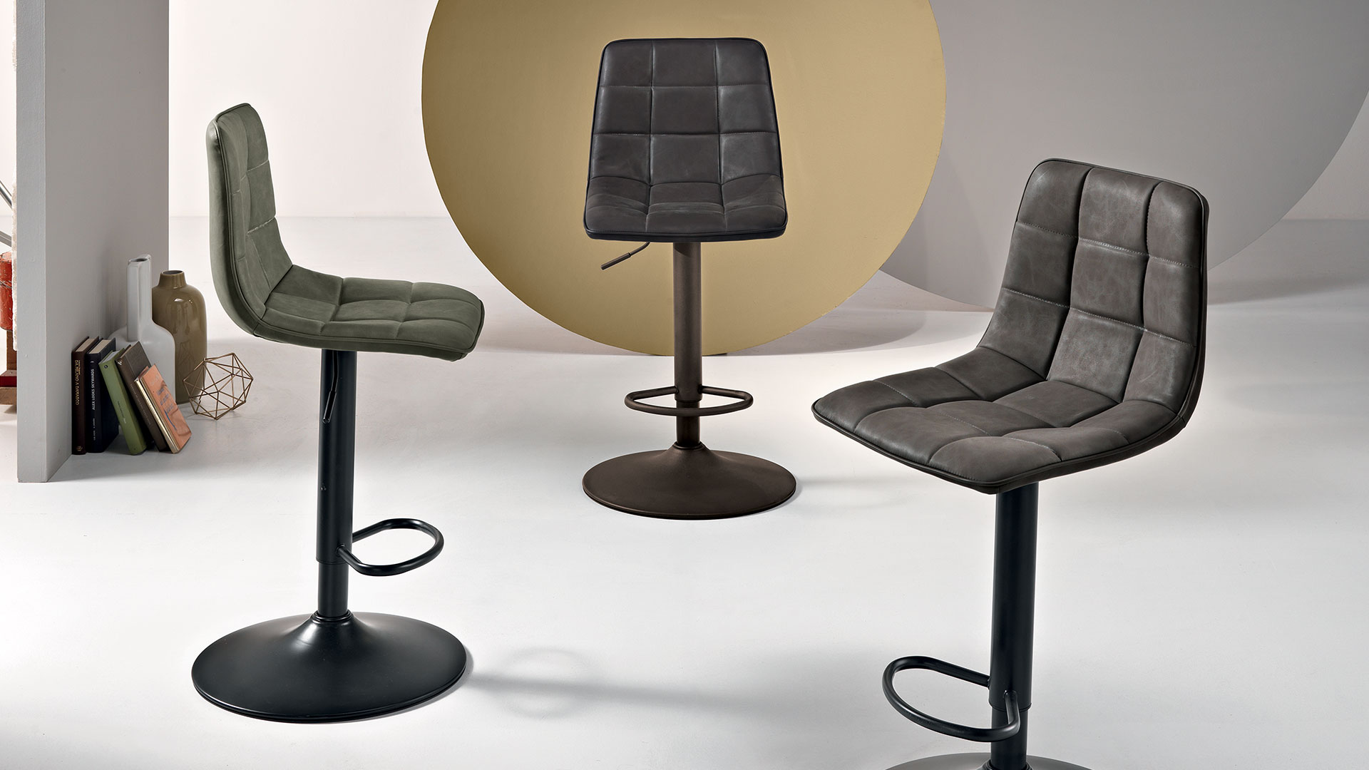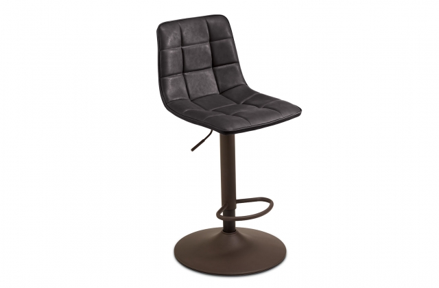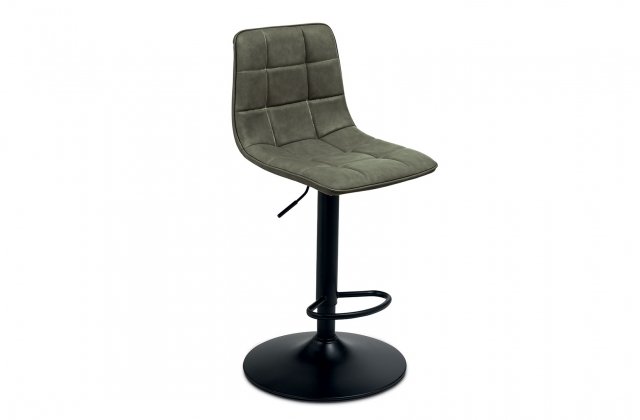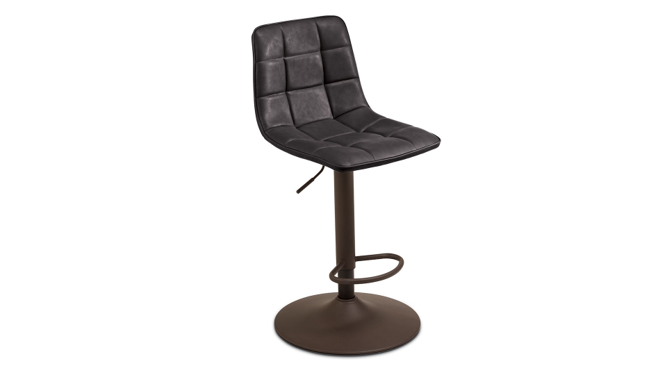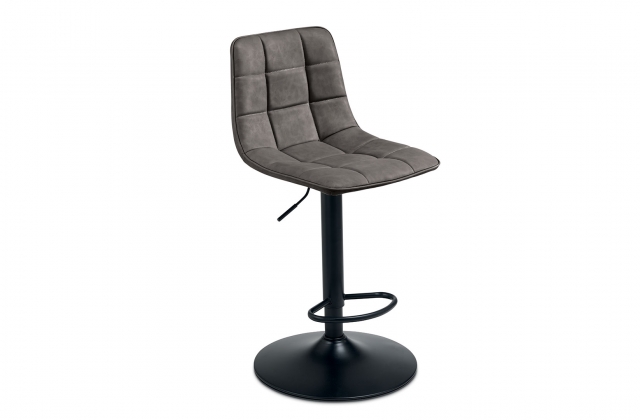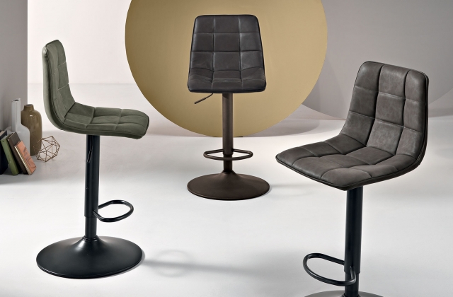 Sgabello girevole con struttura in metallo verniciato, seduta in ecopelle effetto soft touch e alzata regolabile, disponibile in diversi colori.