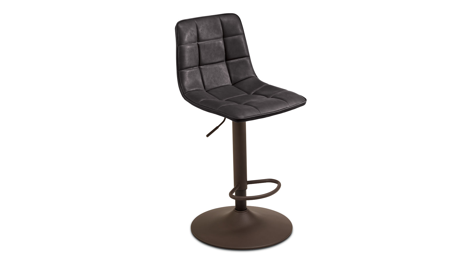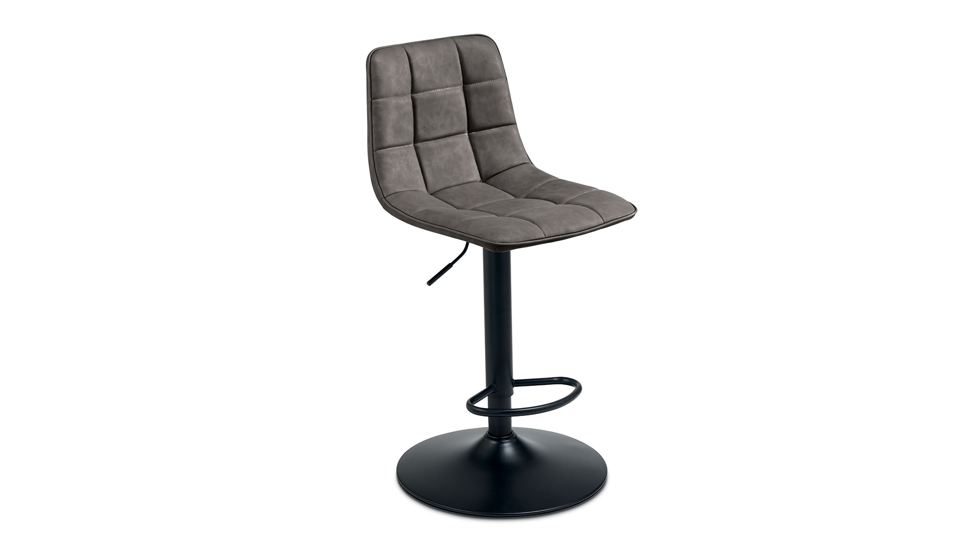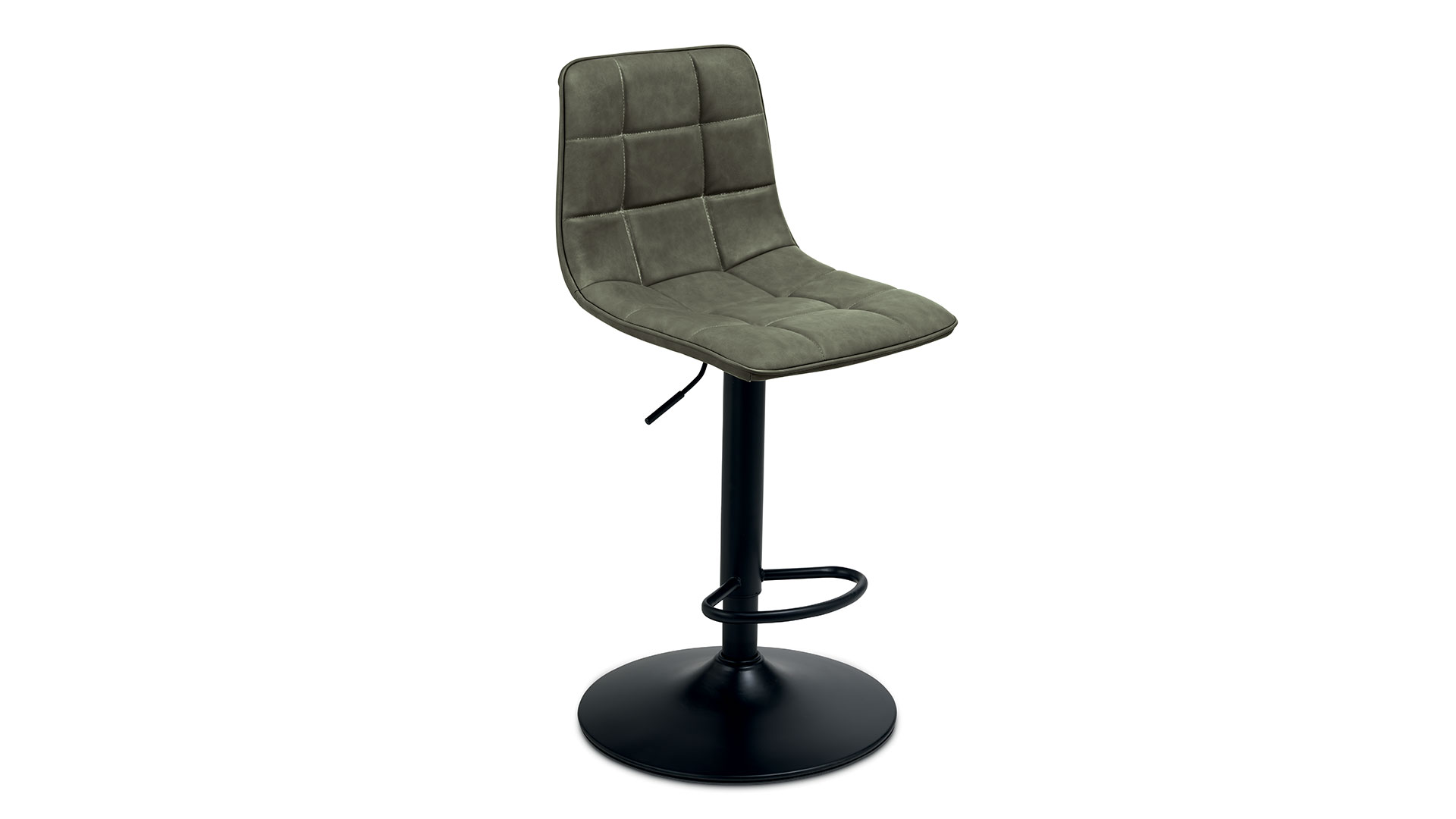 Sgabello girevole con struttura in metallo verniciato, seduta in ecopelle effetto soft touch e alzata regolabile, disponibile in diversi colori.